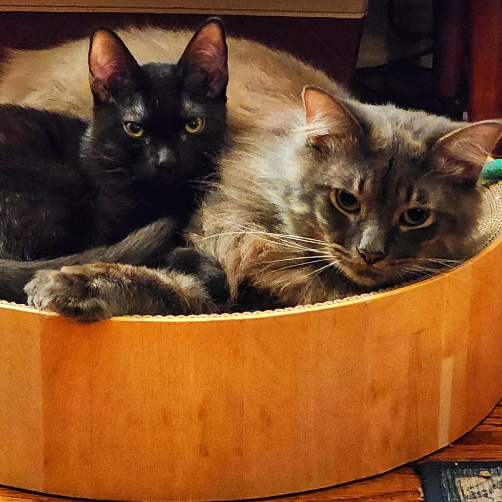 Great news: you can stop scrolling—you’ve found the perfect cat! Say hello to Gouda! Gouda came to his foster parents from the streets of El Sereno, but don’t let his rough start fool you: this big floofy boy is a total lover. Gouda is a squeaker and a squawker who (mostly) patiently waits on his perch for breakfast, sharing encouraging little squawks with his foster mom. If you talk back to him, he’ll happily keep the conversation going, and his lovely green gaze could melt even the hardest of hearts. Gouda will do just about anything for a treat (creamy Churu, anyone?). He’ll even offer up his tootsies for a nail trim if it means an extra snack. He may look more like a wild creature than a house cat, but he is deeply committed to his comfy indoor life with his people and foster siblings. And while he’s a full-grown cat, make no mistake—Gouda loves to play. He scrabbles around chasing toys, zooming through the house, and wrestling with his foster brother and best buddy Top Banana (KRLA-A-85329), who is also available for adoption. One of Gouda’s sweetest qualities is how much he adores the babies. He can often be found snuggled up with one (or two… or three!) little foster kittens, happily grooming them, keeping them warm, and soaking up their tiny cuddles. He is a gentle, comforting presence for the youngsters and takes his role as “big floofy uncle” very seriously. After a day of playing and supervising his kitten crew, Gouda will happily flop beside you on the sofa and grumble his way to sleep. He has made himself quite at home and loves to lounge luxuriously, soaking up pets, chin scritches, and belly rubs. Gouda “loves the ladies” and does best with female cats or younger males. He likes to be the big man of the house and can feel a bit threatened by other large adult male cats, so a home that suits his preferences will help him thrive. Now that you’ve found this truly Gouda-est boy, please reach out to his foster family at elserenocats@gmail.com. You won’t regret opening your heart and home to one of the most lovable, talkative, and entertaining cats around.