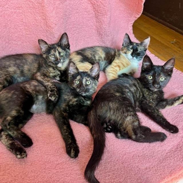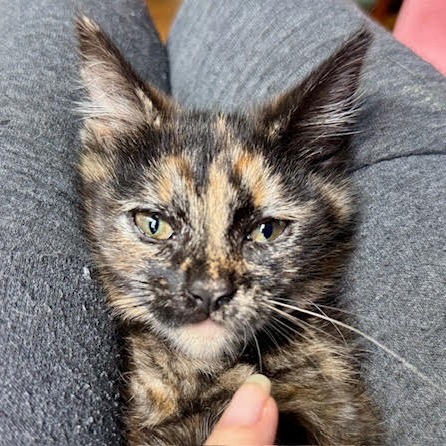 The 4 kittens’ mama was evidently experienced, because she did an excellent job. Cordelia is a tortoiseshell with a sprinkling of orange fur and some orange stripes on her legs. Cordelia is a beautiful kitten! She is super sweet and affectionate, and loves to be held and petted. She is very playful! She needs another kitten as a companion, and one of her sisters would be ideal. However, if you have a young cat who would enjoy a companion, that would be fine too. This cat is located at the Cat Cafe Lounge, https://www.catcafelounge.com/, please contact the foster at jenflorez@kittenrescue.org