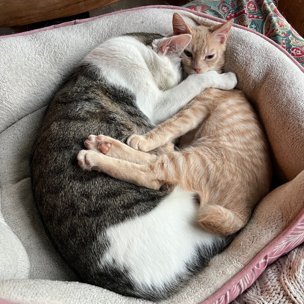Sweet, mischievous and possibly a little smooth-brained, Herbie is a wonderful little bob-tailed kitty who gets along with everyone. He's the life of his foster home, befriending people, guests, dogs and cats alike. Nobody can resist the charm of his quivering butt nubbin. Herbie is a consummate lap cat and bed snuggler, usually in the upside-down position. It's a wonderful and slightly weird thing to wake up next to, but his foster parents never get tired of it. While Herbie is a great friend to all the other animals in his foster home, he is incredibly bonded with one of them, a young adult cat named Cheese. The two of them play, wrestle, and cuddle together constantly, and their bond is so strong that their foster parents really want them to be adopted together. You won't regret it - Cheese is similarly outgoing, silly and even smoother-brained than Herbie. His listing is here: https://kittenrescue.org/available-animals/?id=79364380 If you're interested in learning more about Herbie or in opening up your home to him and Cheese, please email their foster dad at ben@kittenrescue.org