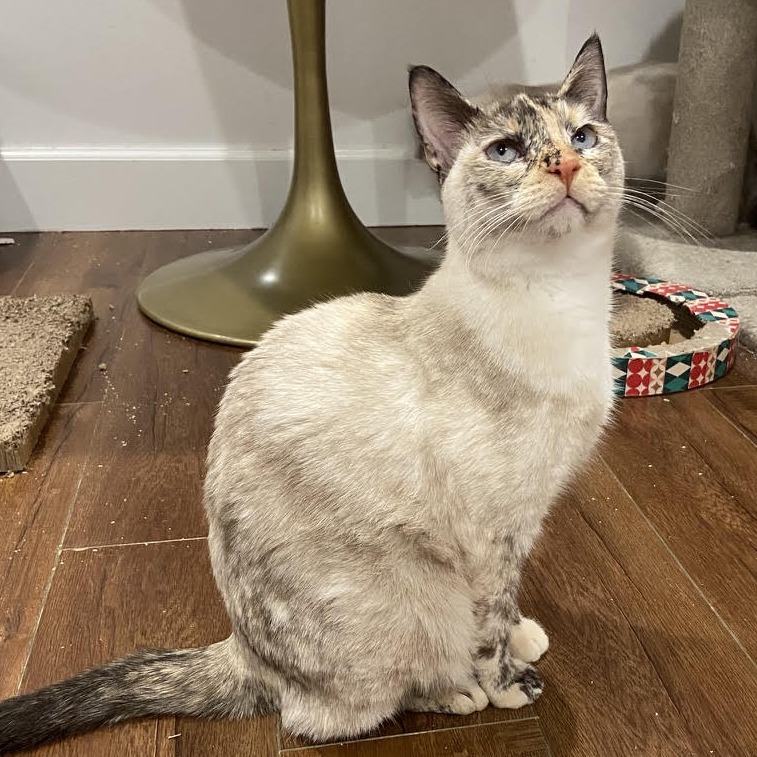 Meet Carly – The Chatty Tortie Point Siamese with a Purr You Can Hear Across the Room! Carly is a stunning young tortie point Siamese with striking blue eyes and the personality to match her unique coat. She’s the total kitten package—curious, playful, and endlessly entertaining. Whether she’s chasing a feather wand, pouncing on shadows, or performing her signature zoomies, Carly brings energy and joy to every room she enters. She’s also a little chatterbox! True to her Siamese roots, Carly has plenty to say and isn’t shy about sharing her thoughts—whether it's a gentle “mew” to say hello or a full-on kitten TED Talk when it’s mealtime. When she’s not playing or chatting, you’ll likely find her curled up nearby, purring like a motorboat while she recharges for her next adventure. Carly would thrive in a home with another young cat or a playful dog to keep her company. Kittens do best with a buddy—they learn social skills, burn off energy, and stay out of trouble (well, less trouble). If you don’t have a companion animal at home, we’d love to help you adopt a second kitten along with Carly! If you’re looking for a little sass, a lot of love, and a kitten who will grow into your very best friend—Carly’s your girl. Please contact the foster at micheleflocker@gmail.com