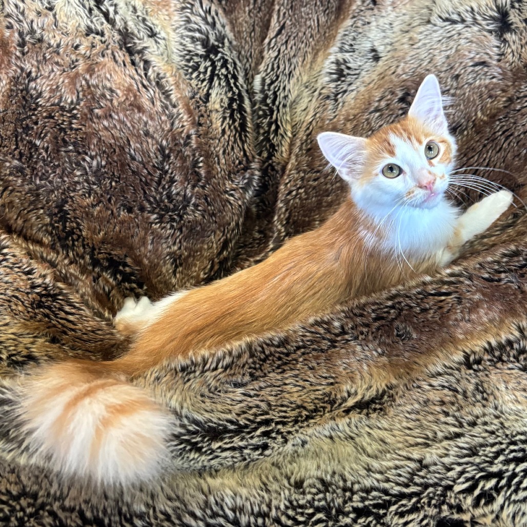 Pomelo is the impish class clown of the bunch. He is friendly, confident, energetic, hilarious, and always in the middle of the action. Once he tires out, he is a sweetheart with people and loves human affection. Because of his age and energy level, Pomelo must be adopted to a home with another young and active kitty. Follow Pomelo and his foster siblings on Instagram @kizmetkats. Please contact the foster at kizmetkats@gmail.com