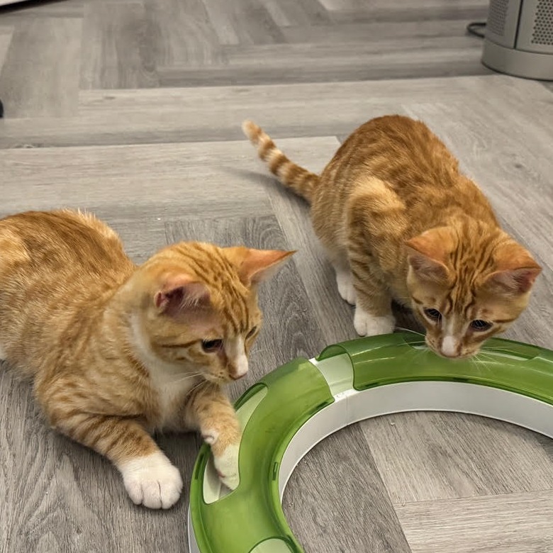 It’s double trouble! Cheese and his brother Nacho, KRLA-A-86165 were bottle babies raised by a KR volunteer from the time they were 2 days old, so they really couldn’t be any more comfortable with humans. They are little purr machines and love everyone they meet! All you have to do is look at them and they’ll come running right over, eager for scritches or playtime. They are currently in the “velociraptor” kitten phase and can be a bit of a handful (they think literally everything is a potential toy, so be sure to keep them away from any wires or other hazards, or anything you don’t want knocked off your tables or damaged), but once they settle down, they just love to cuddle and be in your lap. It’s hard to judge since their personalities are so similar (pretty sure they take turns sharing the infamous single orange cat brain cell), but Cheese might be just a tiny bit more mischievous than his brother, Nacho. They are both such little sweethearts, though! They are the friendliest, most snuggly boys you could possibly imagine. Please contact the foster at allykatty1@outlook.com