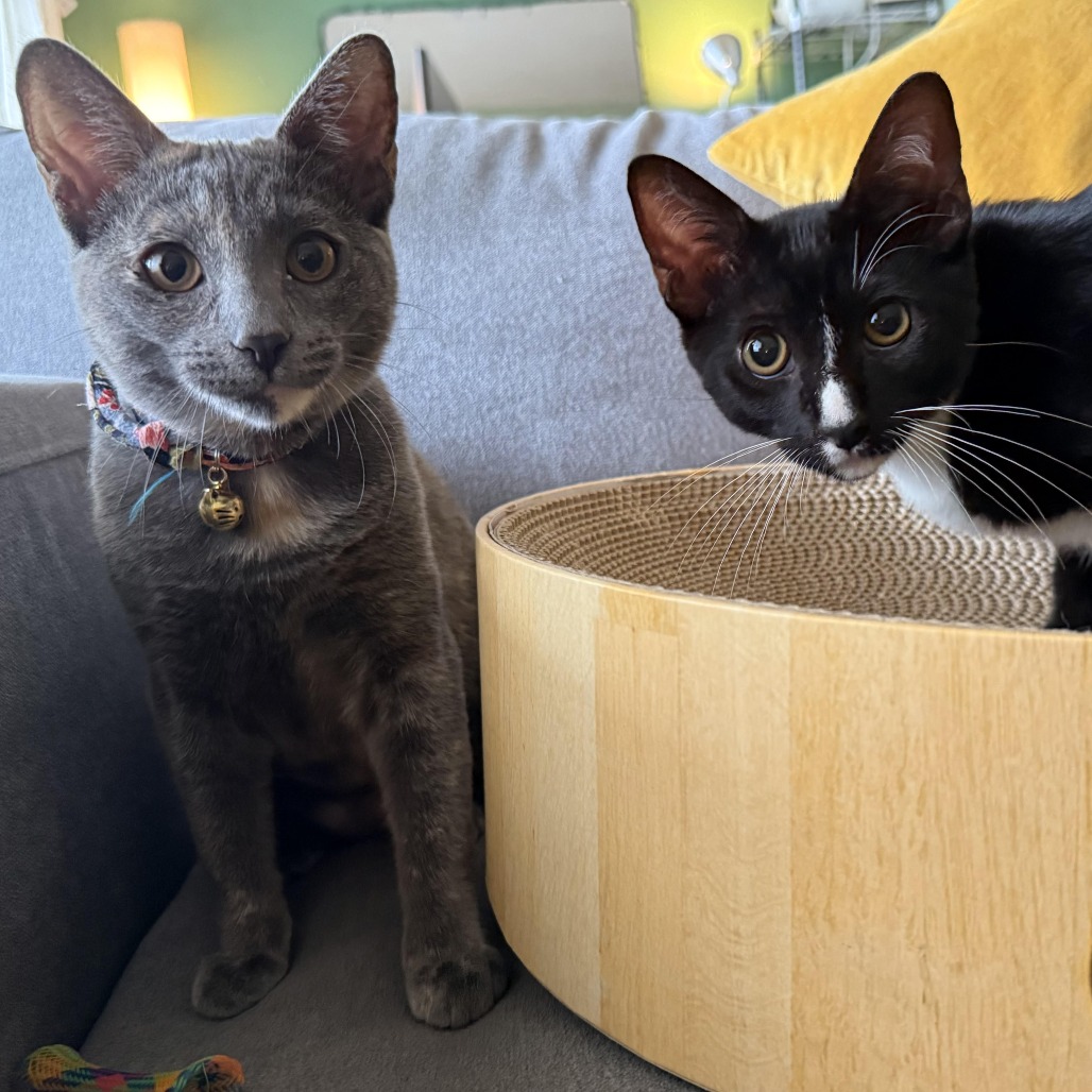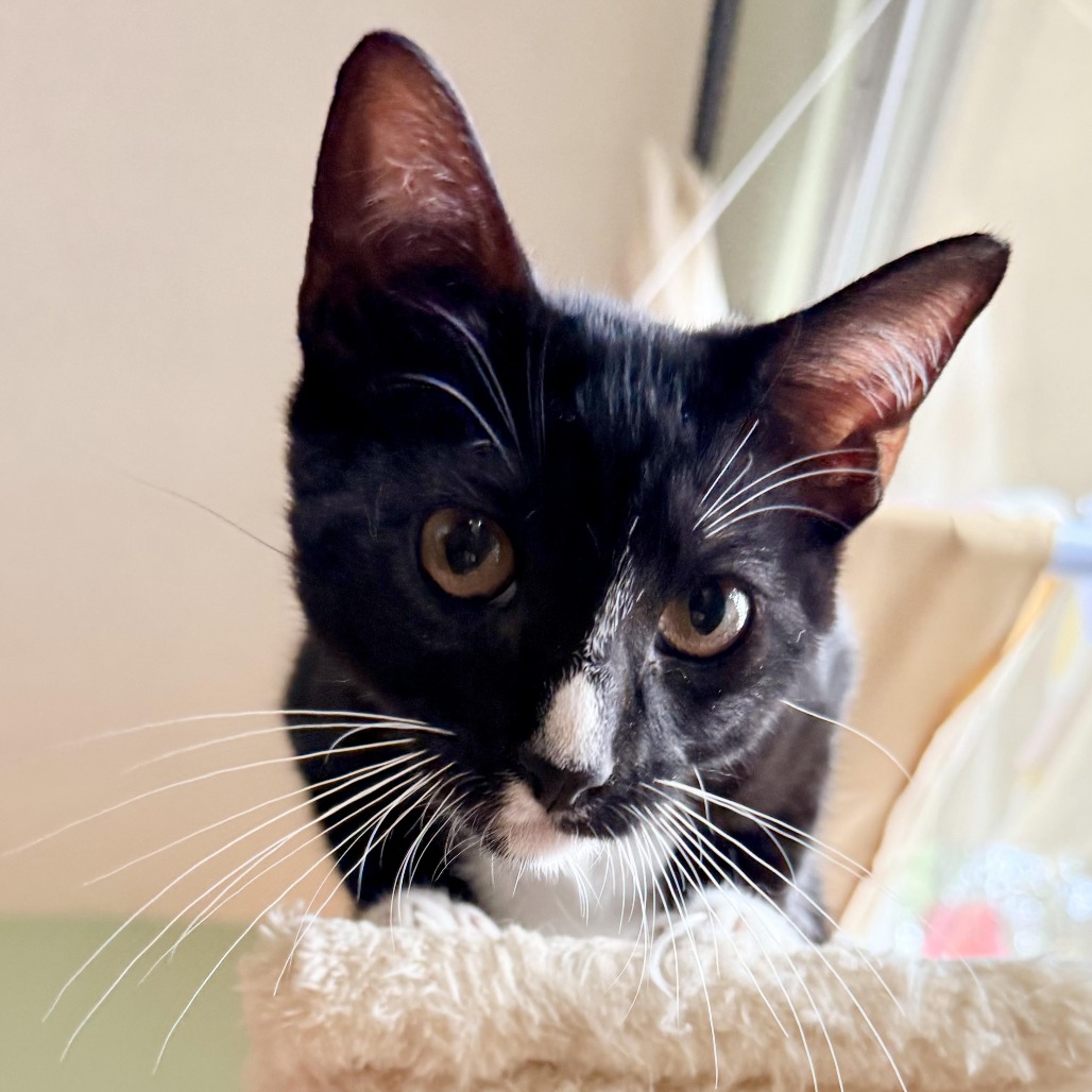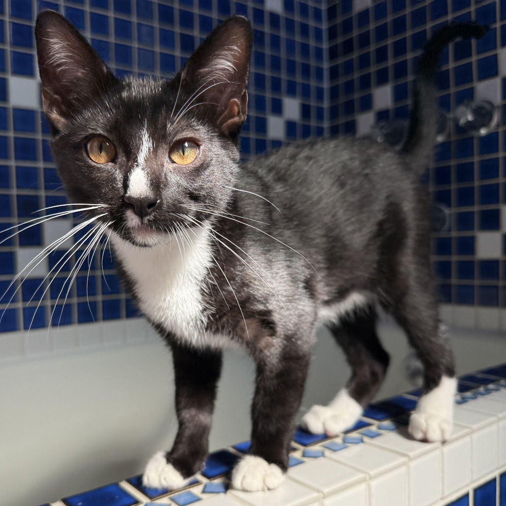 Meet Lucien von Meow: part explorer, part water spirit, and 100% irresistible tuxedo mischief-maker! Lucien is a curious and playful young cat. Whether he’s scaling the highest furniture for the best view in the house, chasing toys, or flopping over for some well earned belly rubs, this dapper little gentleman is always up for an adventure. He has a sixth sense for running water, turn on a sink or shower, and Lucien will appear like a furry ninja, ready to bat at droplets or splash around. A true connoisseur of indoor water features! As a growing kitten with lots of energy, Lucien thrives with a feline friend to play with. He must go to a home with another young cat. Lucky for you, his foster sister Stevie (KRLA-86828) is the perfect partner in crime. Adopt them together and double the fun, cuddles, and cuteness! Lucien von Meow is ready to rule your heart and your highest bookshelf. Please contact the foster at camerontaggesell@gmail.com