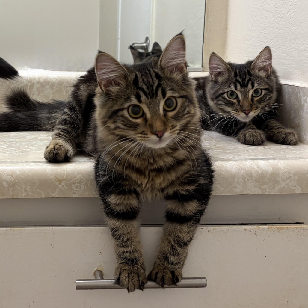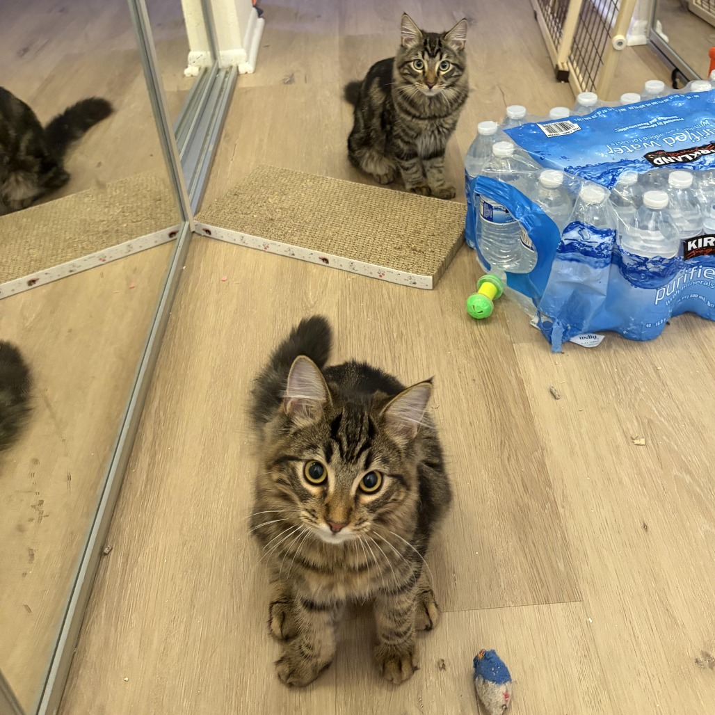 Larry is the softest tabby in the litter, he feels as soft as a rabbit. He is the biggest scaredy cat and will overreact in the funniest ways. When he gets startled he becomes a cartoon in the way he jumps straight up and scurries away. The way he runs in place when taking a turn is absolutely hilarious and dramatic. He loves to play with his siblings and the fishing poles with bells and feathers are his favorite. He is so cuddly and sweet when it’s cuddly time, but would always prefer to run around with the rest of his litter. Larry is the first one to come running when it’s mealtime, and second to playtime. Fun fact: he only likes pictures with his brother Dingaling, KRLA-A-86554! Please contact the foster at lexinesk@yahoo.com