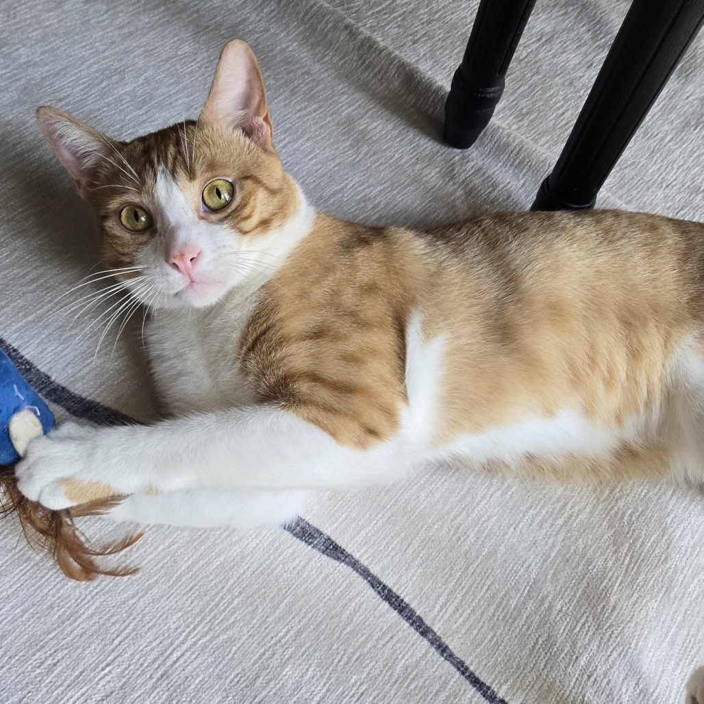 Meowchi is an easygoing, social boy who makes friends the moment he walks into a room. He greets new people like familiar pals and never passes up a chance for attention. He’s a true cuddle fan and happily settles in beside you whenever you’re relaxing. If you’re looking for a cat who genuinely enjoys human company, he’s your guy. He also gets along well with dogs and is confident around them, making him a great fit for a multi-pet home. He loves to play chase and wrestle with his Maltese foster sister, keeping everyone entertained with his friendly energy. And when his favorite bird toy comes out, he shifts into full hunter mode—focused, quick, and ready for action. Meowchi is very curious about food and always checks in on what’s happening in the kitchen. He meows politely for treats and considers mealtime a highlight of the day. Whether he’s curling up beside you, asking for a snack, or pouncing on his feather toy, Meowchi brings a warm, cheerful presence to any home. He would thrive as an only cat or as a gentle companion to other respectful cats and dogs. What he needs most is kindness, a cozy place to nap, and a person who appreciates his sweet, loyal nature. He’s ready to meet his new family and become someone’s best buddy. If you’d like to see videos or set up a meet-and-greet, please contact his foster at wangxx05@gmail.com