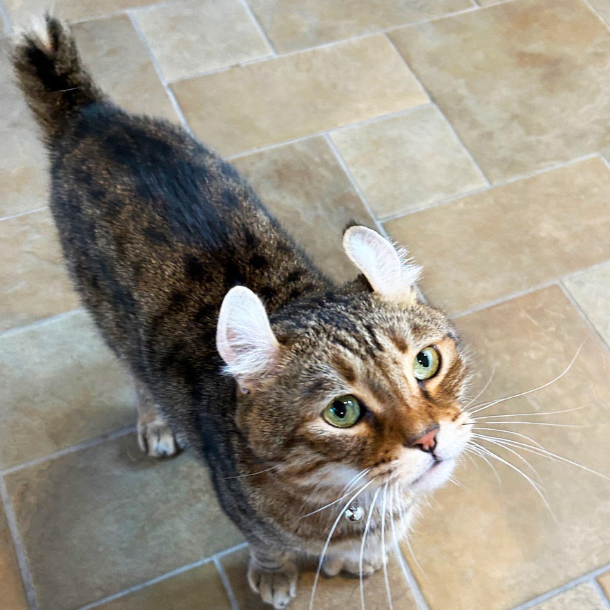 SPECIAL NEEDS: Special diet; monitoring of litterbox due to history of urinary obstruction and PU surgery to correct blockage. High energy, attention-loving kitty will need daily play sessions and lots of attention. Peanut is a bundle of loving energy. Although he’s 4 years old, he plays like a kitten--blazingly fast at chasing wand toys. With a face that’s part tabby, curly ears, and a smidge of “Grumpy Cat”, his looks are unique! Smart as heck, sweet and friendly, he wants to be with you, and get pets, head and tummy scratches. Kitten Rescue saved Peanut from the LA shelter, where he had become blocked and couldn’t pee (a life-threatening situation). He had surgery to solve this and is fully healed, but his forever home needs to maintain him in a low-stress environment and monitor his bathroom habits to ensure he doesn’t get blocked again. He must be on wet (canned) food suitable for his condition to ensure his ongoing health. For these reasons, as well as his kitten-like qualities that require patience and dedicated time spent playing with him least twice a day, he would be best with experienced cat owners working from home or a family who’s willing to give him the care he needs. In return, Peanut will greet you at the door, follow you around the house, and keep you company while you work. His curly ears and bob tail, as well as his giant feet and polydactyl toes will enchant you; and his easy-going manner and friendliness with everyone make him a crowd-pleaser. Contact the foster at: Jenflorez@kittenrescue.org.