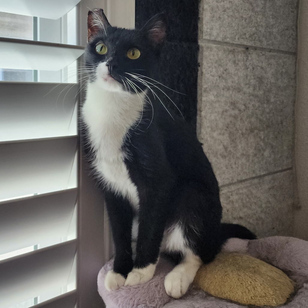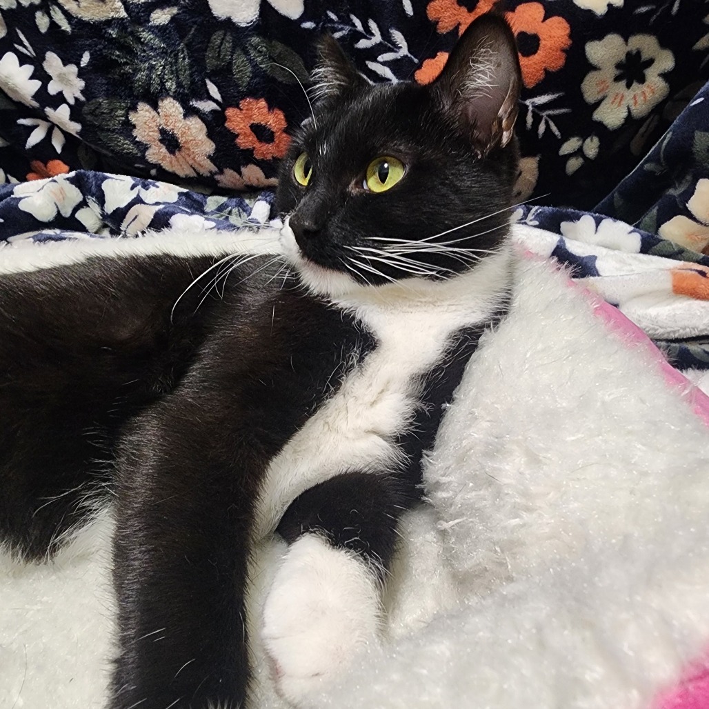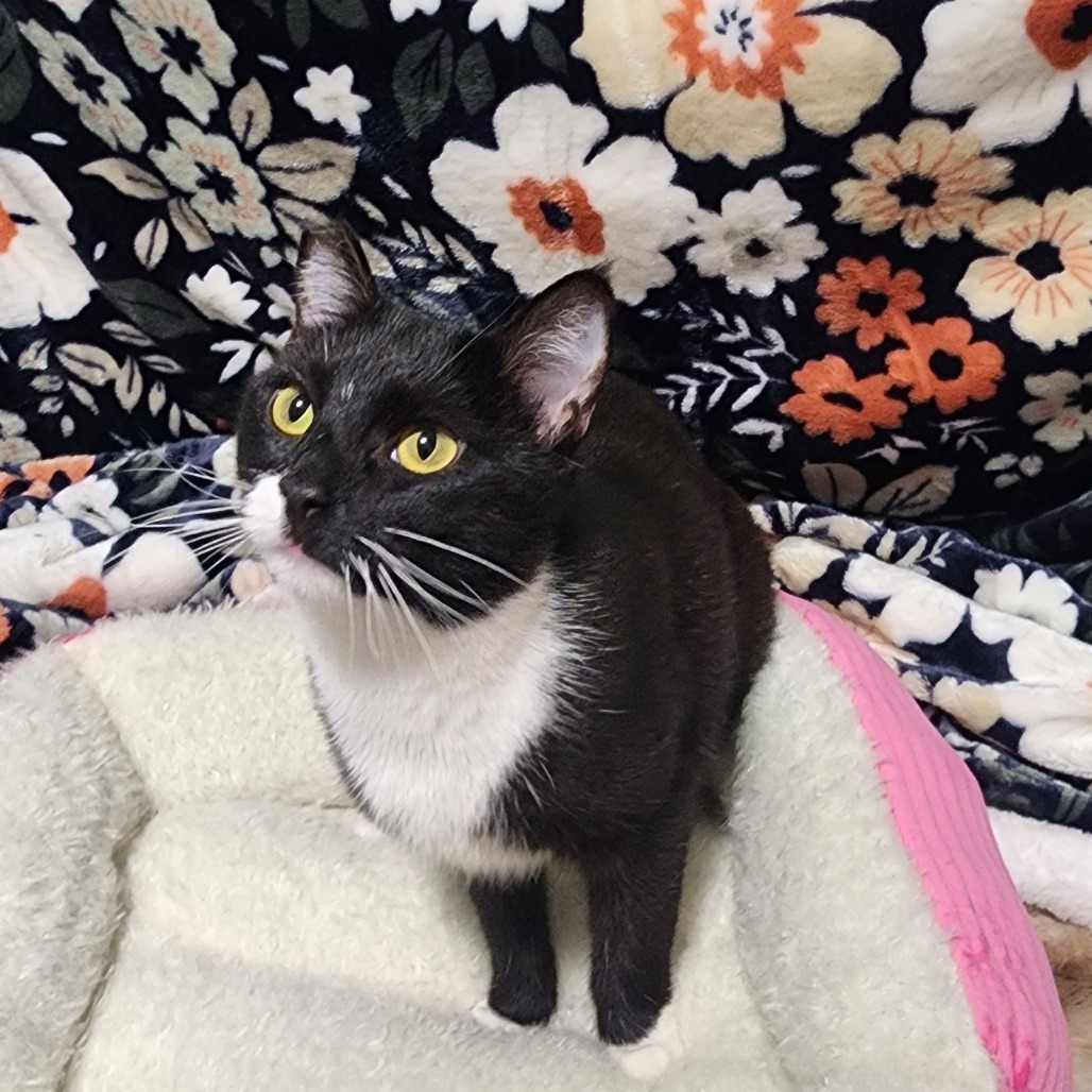 Aria is a gentle, tuxedo kitten full of personality and charm. She loves to play and eagerly explores every new toy and cozy bed you bring home. Affectionate with touch, she enjoys being petted and will happily make biscuits, though cuddles happen strictly on her terms. Aria is vocal, expressive, and always ready to “chat” with her people. A great eater and a joyful companion, she’s the perfect mix of independence and affection. She would do well in a home with older cats as her younger foster siblings have too much energy and she would rather not babysit. Please contact the foster at anneliuxd@gmail.com