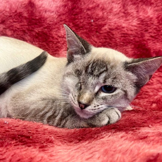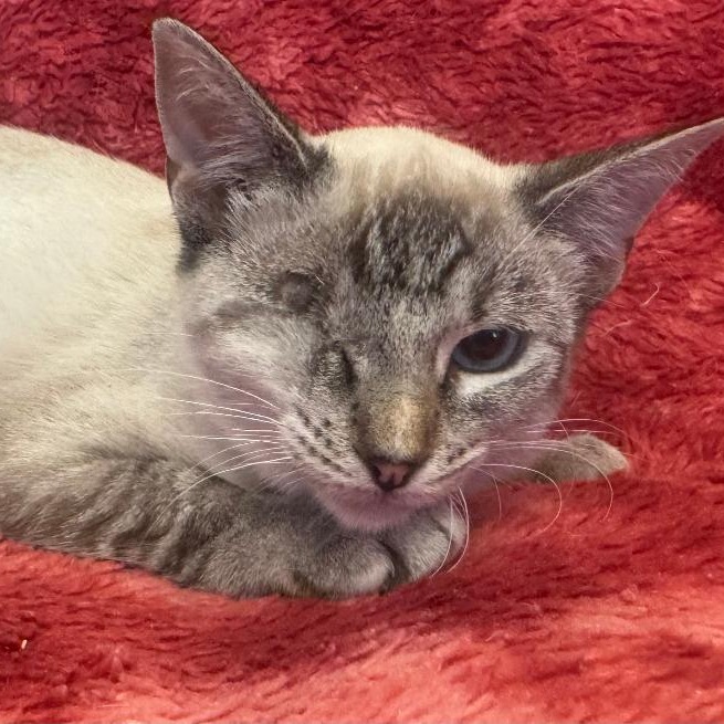 Figgy is a sweet and loving lap girl who loves to be held and will give you all the purrs. A KR volunteer saw her up for adoption at the shelter with a severely damaged eye; where she was hiding and not eating or drinking. She was taken into foster care and started on medication and drops to try to save her eye. After a while it became clear her eye could not be saved and she was taken to the clinic for surgery, where she was found to have a ruptured eye. She felt much better after surgery, and after two weeks had her sutures taken out. Because of this early trauma of being in the shelter and having surgery, she may take a bit to become used to her new home. She may hide at first, because she is shy, but if you show her the love she deserves and get to know her, she will decide she want to roam your house and sleep on your bed. We just ask you show her a little patience after what she has been thorough. She sees perfect with her good eye and will reward you greatly with her love and loyalty. Please contact the foster at Savetinylives@gmail.com