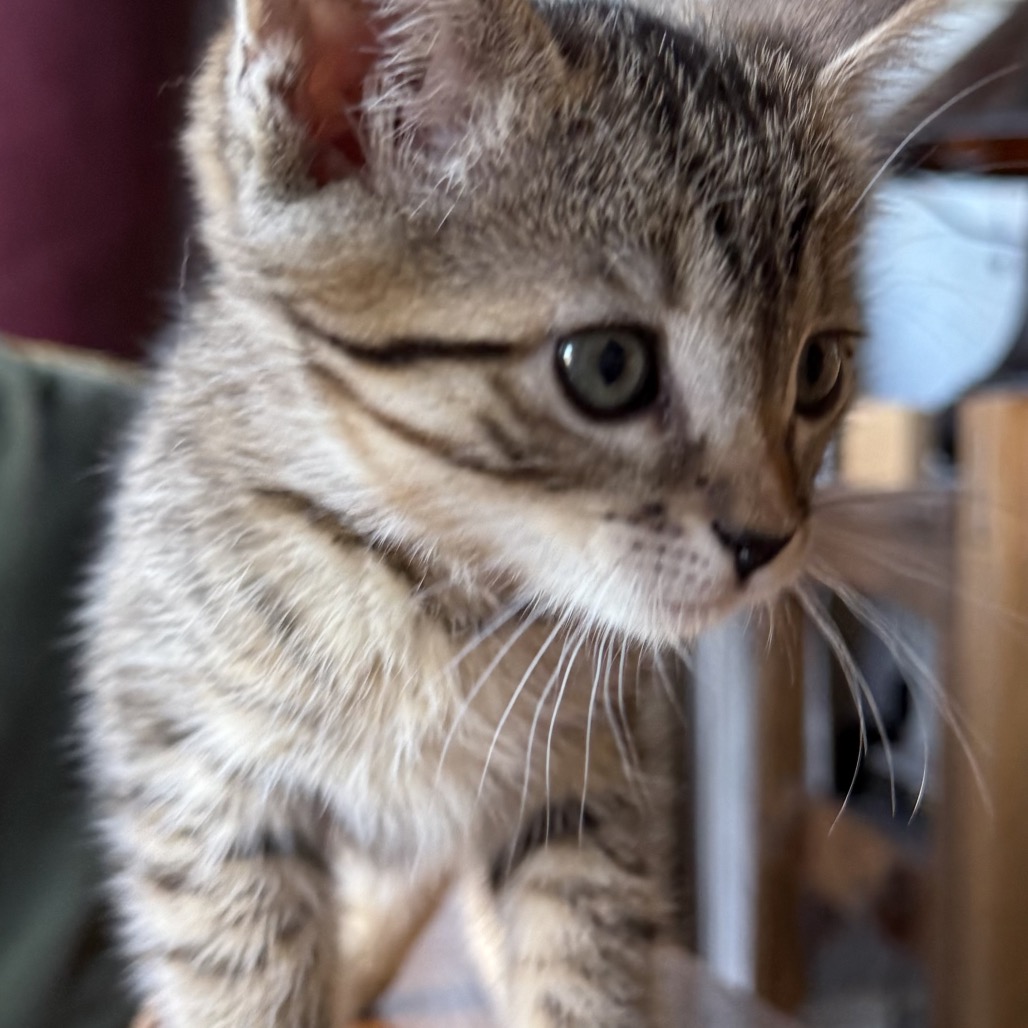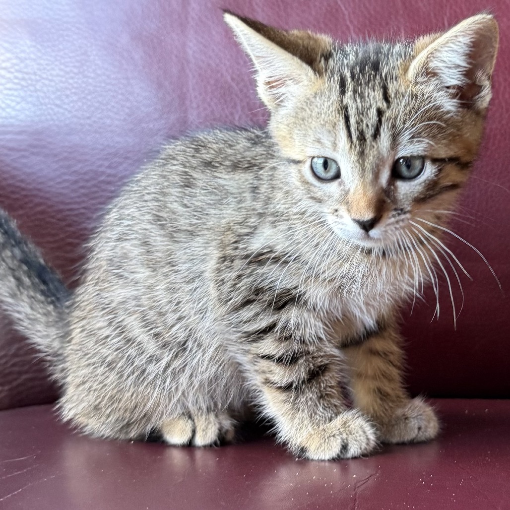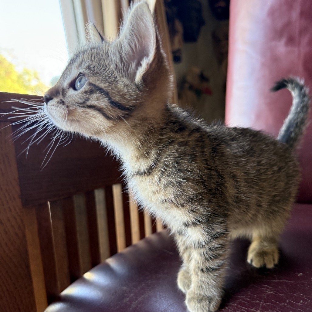 Amber is a spirited adventurer with gorgeous amber-brown stripes to match her lively personality. She loves to run, leap, and explore every corner of her world. Confident and curious, Amber is the kind of kitten who doesn't hesitate to take the lead when it comes to discovering new places. Watching her play is pure joy as she leaps, dashes, and explores with boundless enthusiasm. Once she winds down, Amber's soften side shines through. She adores human companionship and will happily melt into your arms for a well-earned cuddle. With her mix of spirit and gentle affection, Amber is the perfect companion for someone who loves both fun and snuggles. Please contact the foster at laserrano@mac.com