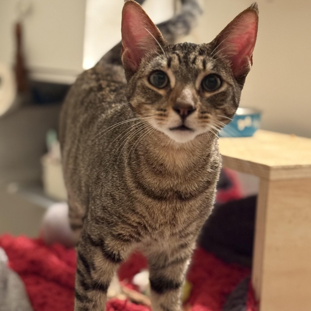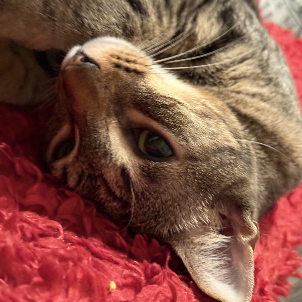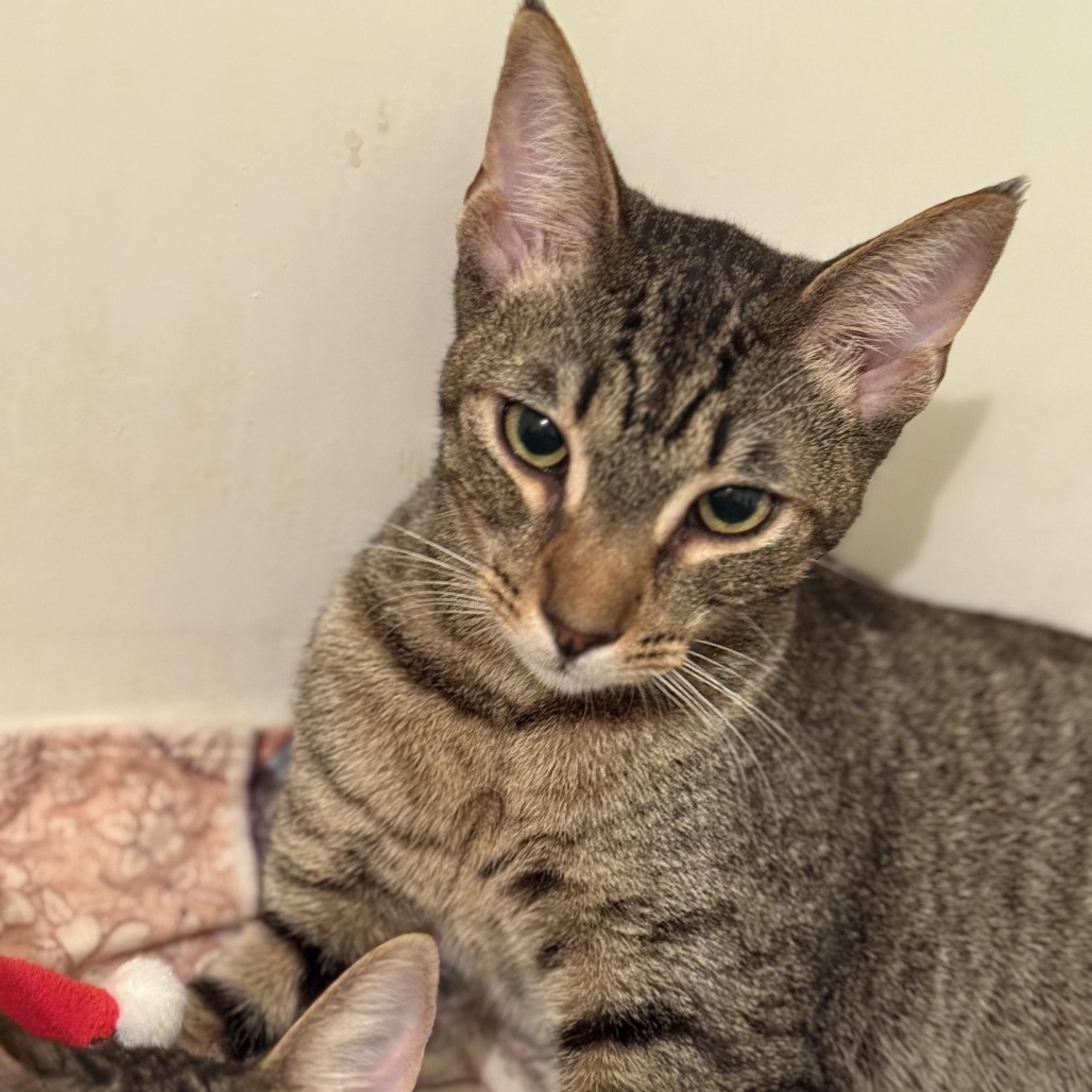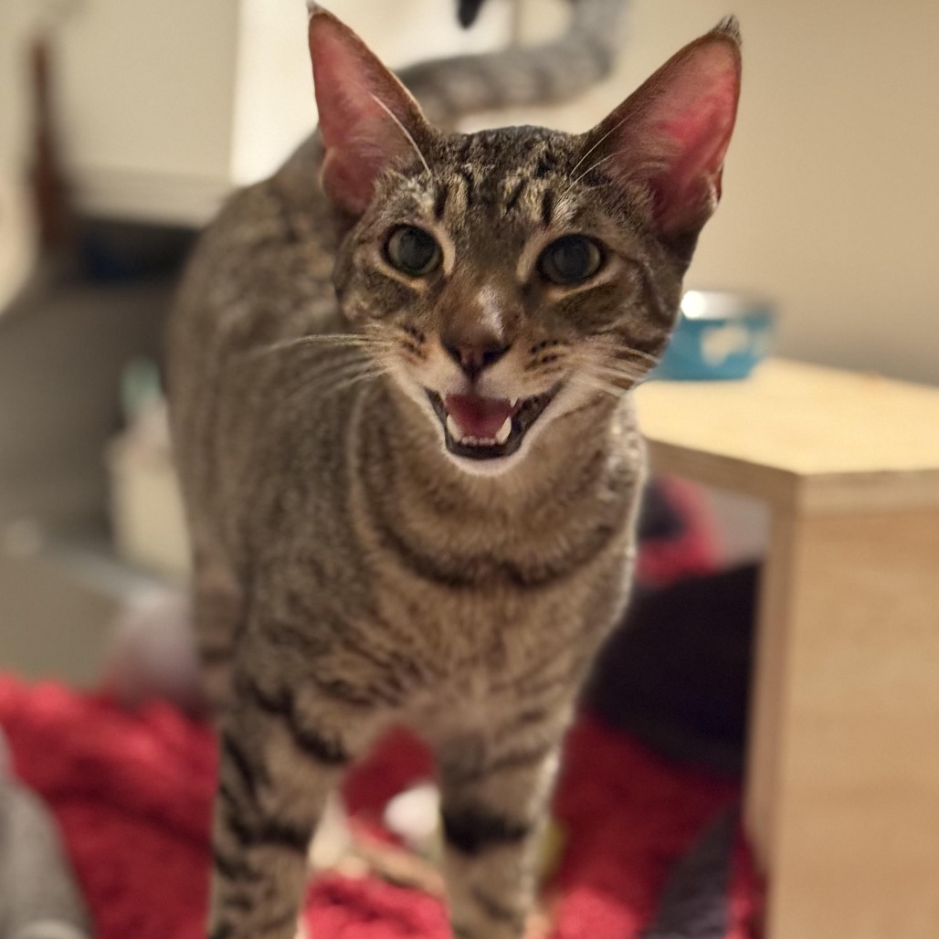 Cosmo is a beautiful young Abyssinian tabby mix with a gentle, graceful nature. He’s very sweet and affectionate and flirty, often following you around, talking to you, and offering soft kisses. He is such a romantic, I call him my little Romeo. He moves with calm elegance and never feels clumsy. It feels soothing to be around him. Cosmo is an intelligent cat and truly enjoys the company of other cats. He especially loves his two sisters, Hailey (KRLA-A-86808) and Stella (KRLA-A-86809), who are just as lovely, and it would be wonderful if one or both of them could be adopted together with Cosmo. Watching the three of them curl around you, each with their own unique purr, is pure joy. They bring so much love and comfort, and would make a wonderful addition to a caring home. Please contact the foster at lady.atk@gmail.com