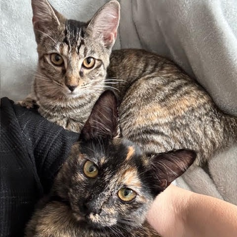 Looking for a kitten with personality? This little Tortie is the one for you! She purrs for pets and gives the cutest little “squeaky brake” meows when she wants your attention. She loves people, loves being held, and will climb on your shoulder if you let her. She’s happiest when she’s near you- unless she’s busy chasing toys or eating treats. She does best when she has company, so being adopted with her sister would be ideal- especially if you’re away during the day. The two of them keep each other busy and cozy. Her sister Charli (KRLA-A-86854) is a sweet tabby with orange splashes, and they’d be a great duo. Please contact the foster at allamysthings@gmail.com