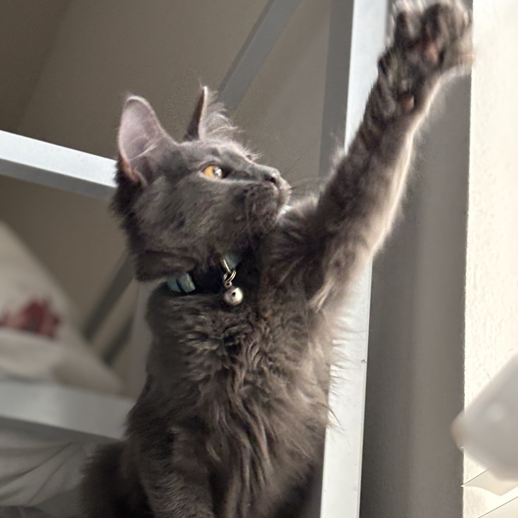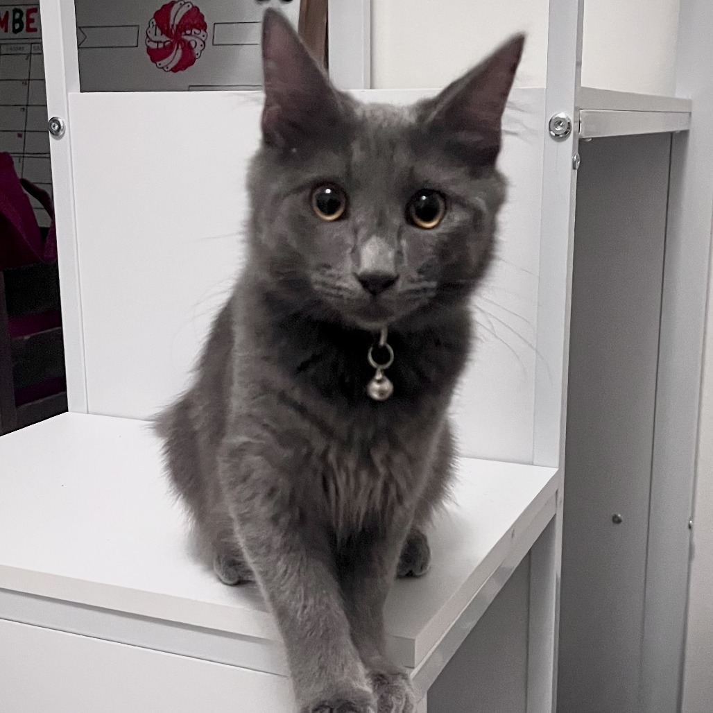 Hi my name is Gumball! I am a very energetic boy who loves to play and explore. I have striking orange eyes and a solid gray coat with just the right amount of fluff that makes me an excellent cuddle buddy. I won’t be afraid to get vocal when I’m ready to be held. I can often be found helping my foster mom with all the chores around the house and I will happily be your shadow too! I love playing with my siblings Jellybean (A-86911), Pancake (A-86914), Waffle (A-86913), and Holly (A-86916) as well as my cousin Mocha (A-87009). I love all kinds of toys but especially springs and crinkle toys. I enjoy curling up in my hammock or by a human’s side. I would do best being adopted into household that already has a furry friend who can be my playmate. Better yet, to be adopted with one of my littermates (optional). Please contact the foster at cortneyjhouseknecht@gmail.com