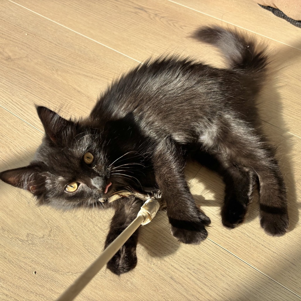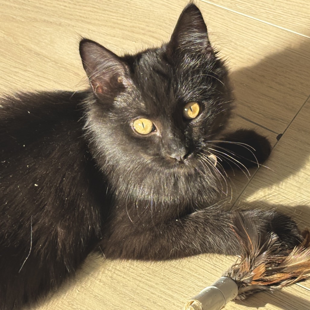 Hi my name is Holly! I am a solid black kitty girl with the perfect amount of fluff and a poofy tail. I have striking orange eyes, but my foster mom’s favorite part about me is my long ear tufts. I am the only girl in my litter of four boys but have no problem keeping up with them. I love to play and stamp around with my back arched like a Halloween kitty. I also “ekekek!” where most cats would meow, which the humans around me find very endearing. My favorite toys are springs and feather wands, though I also love to cuddle. I enjoy watching my foster mom’s fish tank and looking out the window. I get along with other cats and kittens and would enjoy having another furry buddy to play with. Better yet, you could adopt me with one of my brothers Waffle (A-86913), Pancake (A-86914), Jellybean (A-86911), Gumball (A-86912), or my cousin Mocha (A-87009). I am very excited to be your new source of cuddles and joy! Please contact the foster at cortneyjhouseknecht@gmail.com