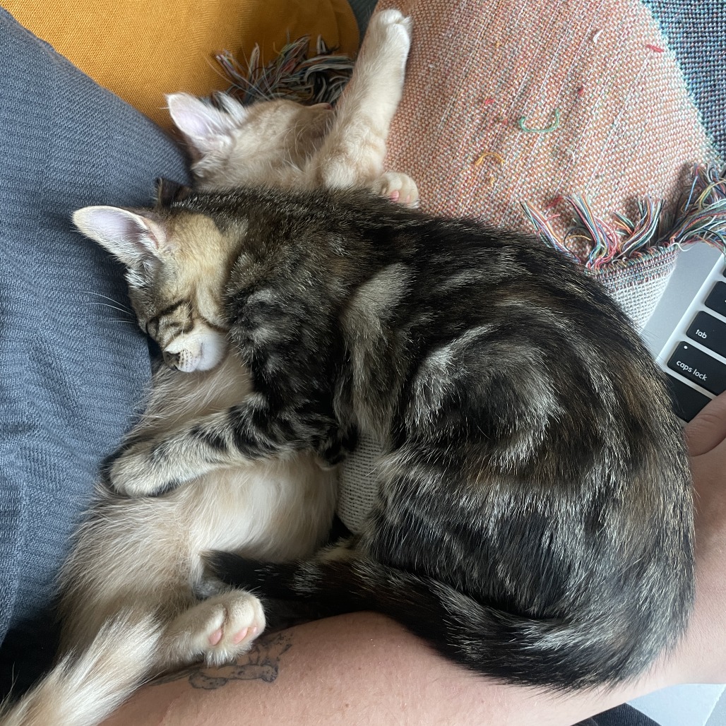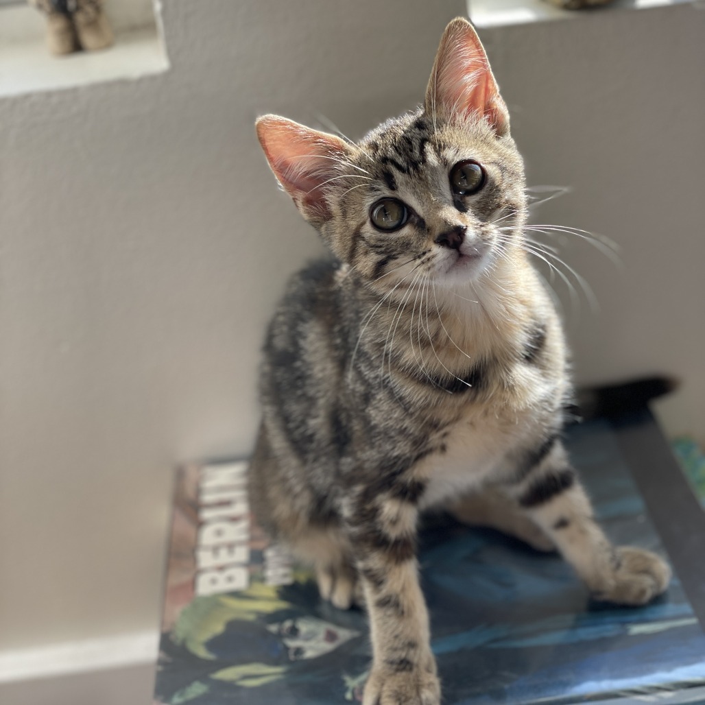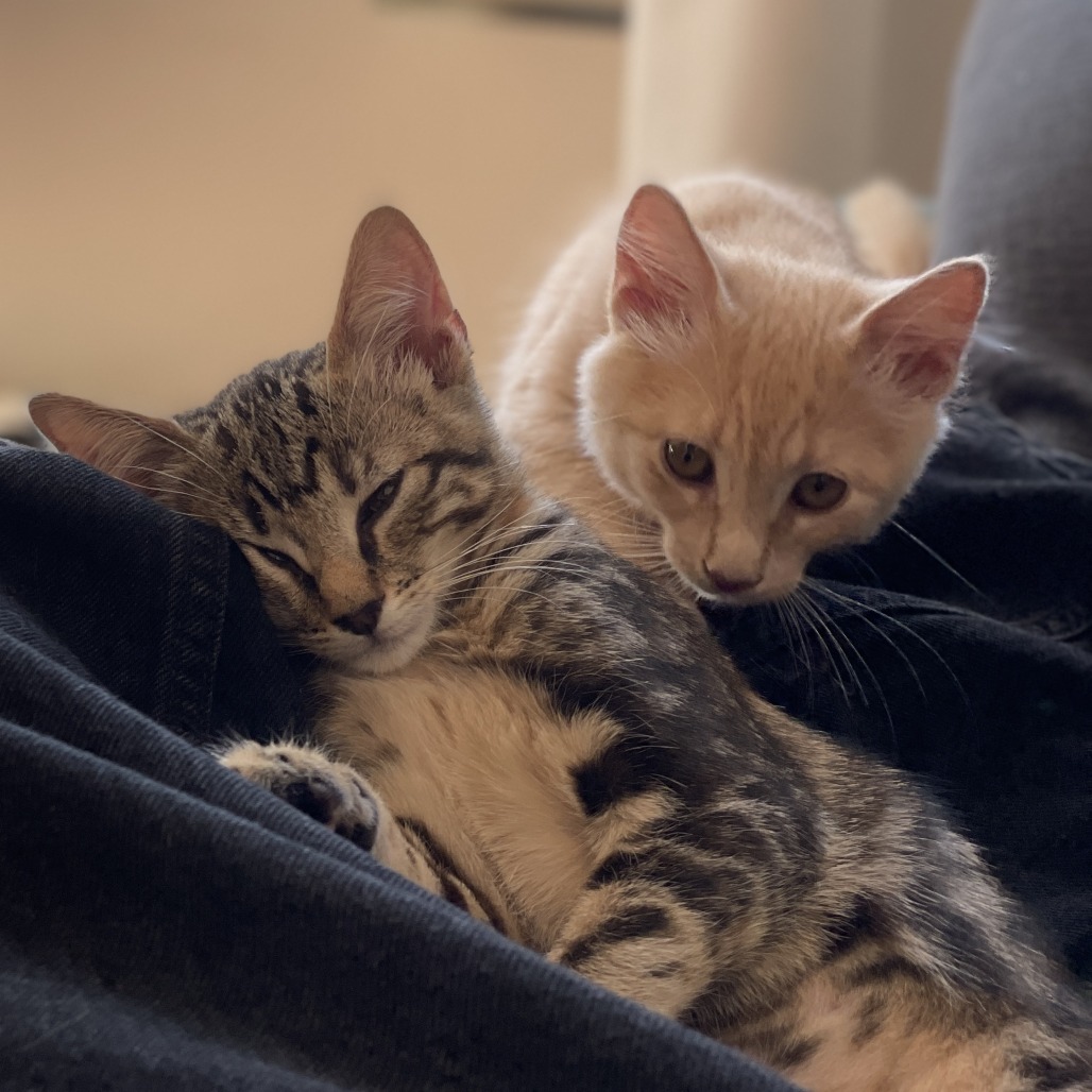 Zara brings pure joy and comic energy into any home, often laugh-out-loud funny. After mealtime, she ricochets from couch to floor and back again with lightning speed, turning the whole room into her personal stage. The moment she finishes her antics, she collapses into your arms or curls up between your neck and chin, determined to get as close as possible to any human who offers affection. She’s a certified lovebug and often falls asleep on her back with her limbs flopped open, chirping happily as she asks for more pets — like the princess she is. She radiates trust and sweetness, and she makes every snuggle session feel like an honor. Zara stays devoted to her brother and best friend, Ajax, KRLA-A-86971. The two spend most afternoons curled together in a cozy, sunlit pile, grooming each other or rolling into shared naps. She’s chatty and absolutely lights up when you talk to her. If you let her, she’ll literally sleep next to your face all night. Please contact the foster at rose.c.maggie@gmail.com