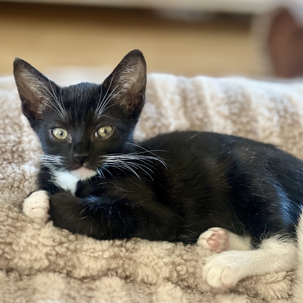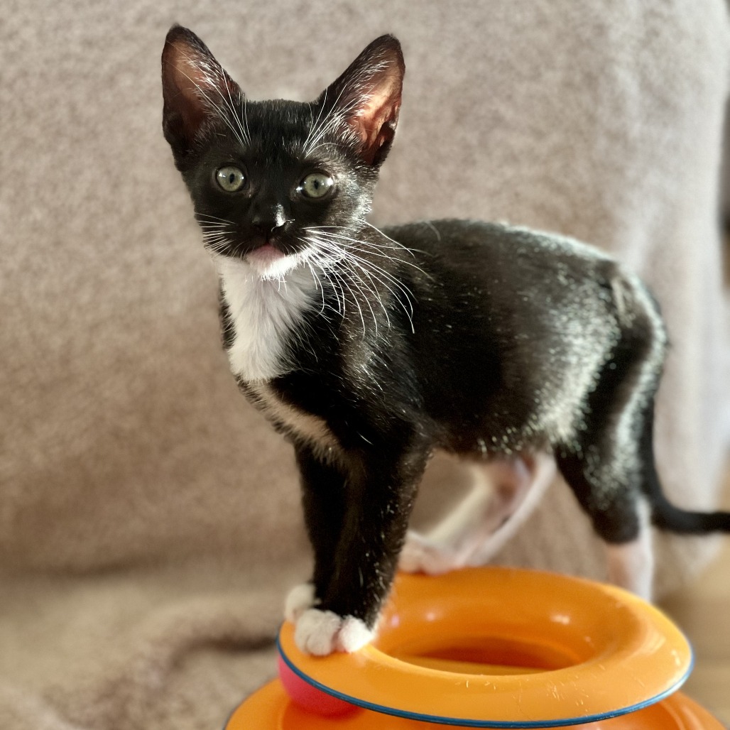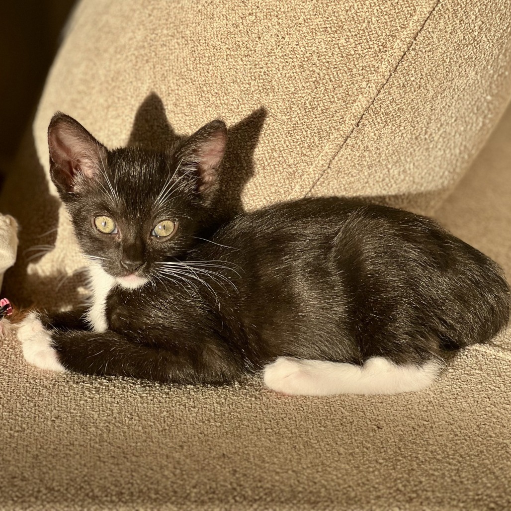 Meet Bean! Bean may be the smallest of his siblings, but he’s got the biggest spirit! This tiny tuxedo dynamo is always the first to chase a feather wand, dart through tunnels, or turn anything in sight into a toy. He’s curious, bold, and endlessly entertaining — the kind of kitten who makes you laugh even on your worst day. When playtime winds down, Bean loves to curl up with his sisters Moo and Bessie, or hang out with his buddy Bram — he gets along great with everyone. Despite his small size, he’s full of heart and confidence. Bean would love to be adopted with one of his siblings (or into a home with another young, playful cat). He’s a sweet, social little guy who thrives on friendship and fun. He's bonded with KRLA-A-87037 Moo, KRLA-A-87038 Bessie, KRLA-A-87043 Bram Please contact the foster at gaskellnagette@gmail.com