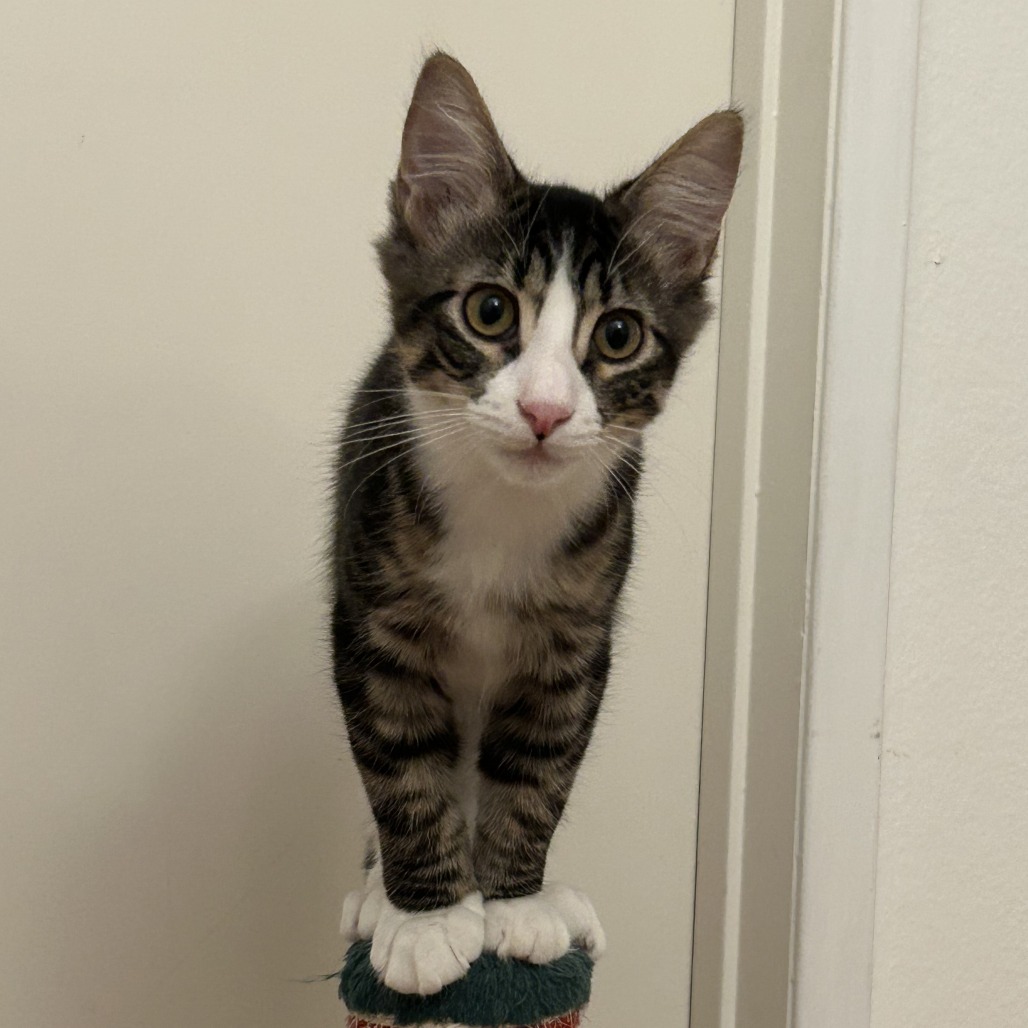 Bourdain is the sweetest, cuddly kitten. He loves to crawl up into your lap and get comfy. He plays hard and loves other cats. He's a bit shy at first but warms up fast once you sit down and grab a wand toy. He definitely needs a friend his own age that can keep up with him. He would do best in a home without dogs or young children. Please contact the foster at maggie0126@sbcglobal.net