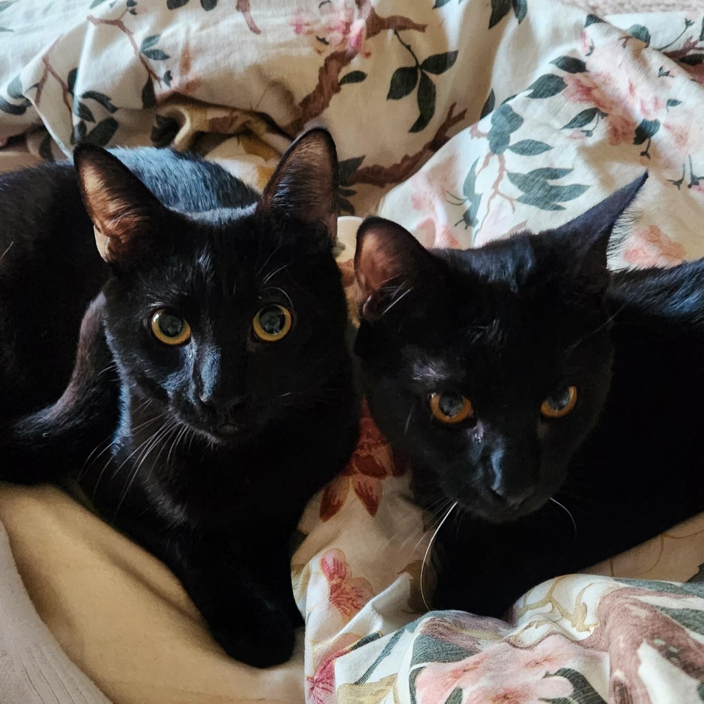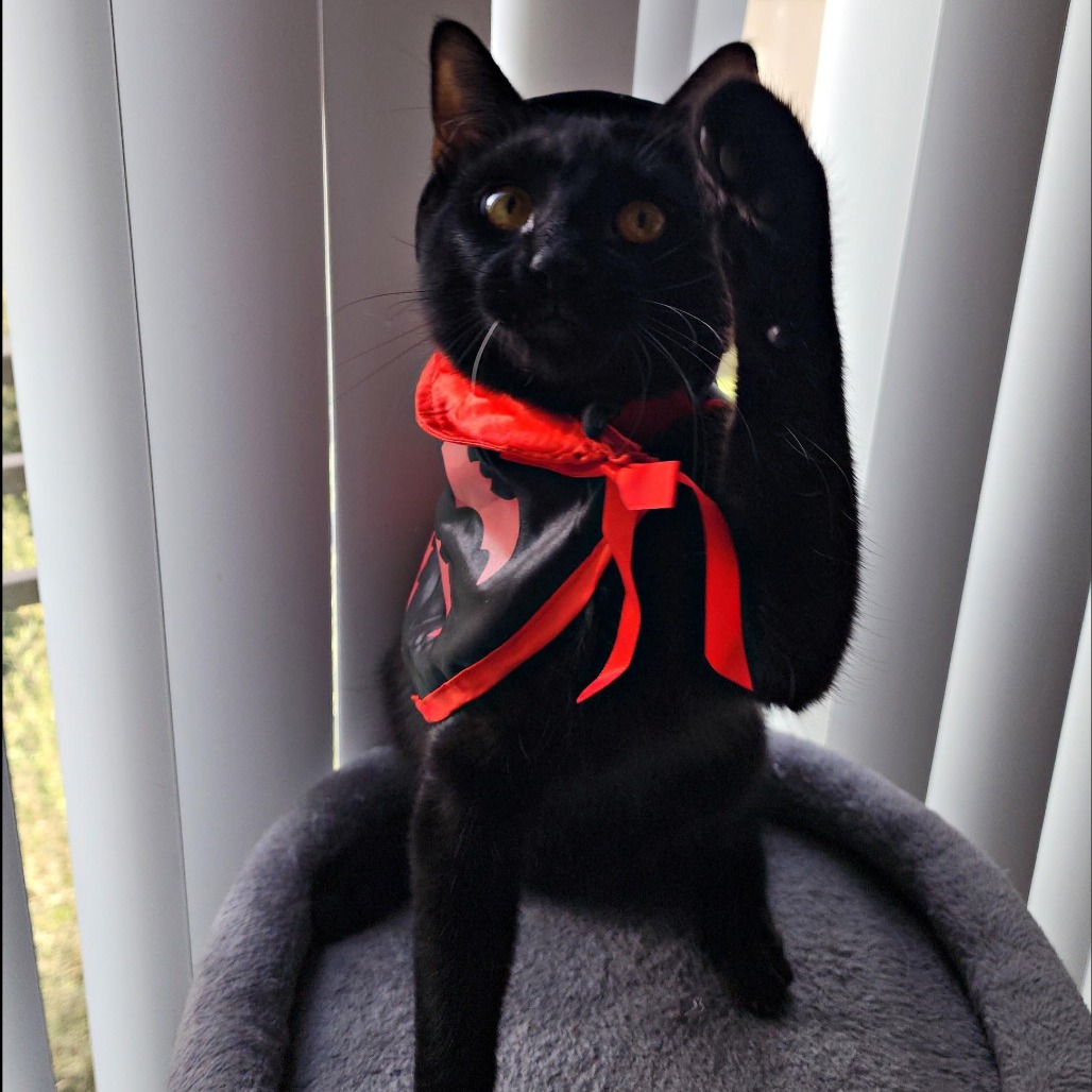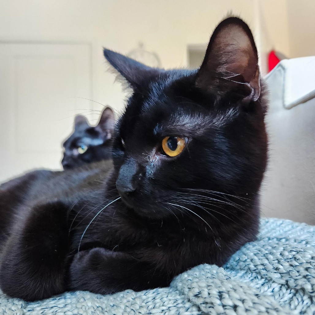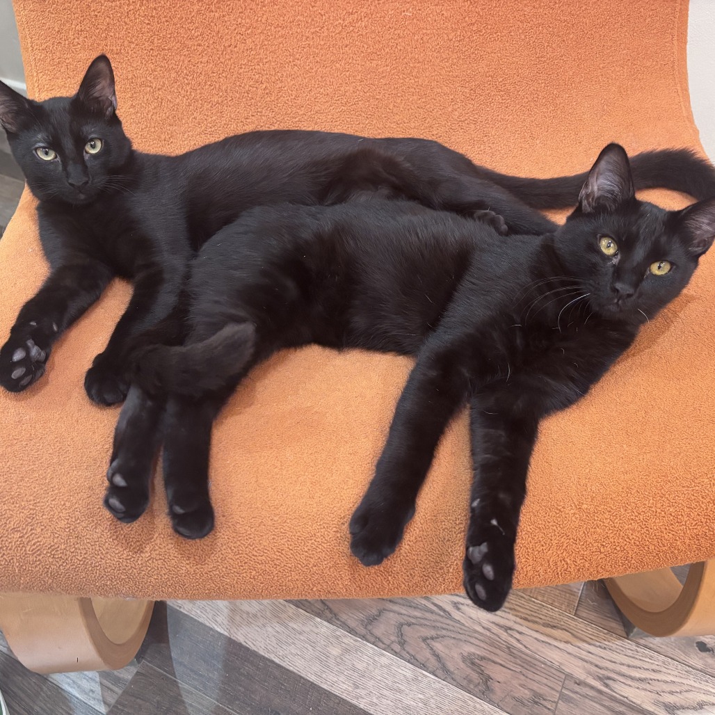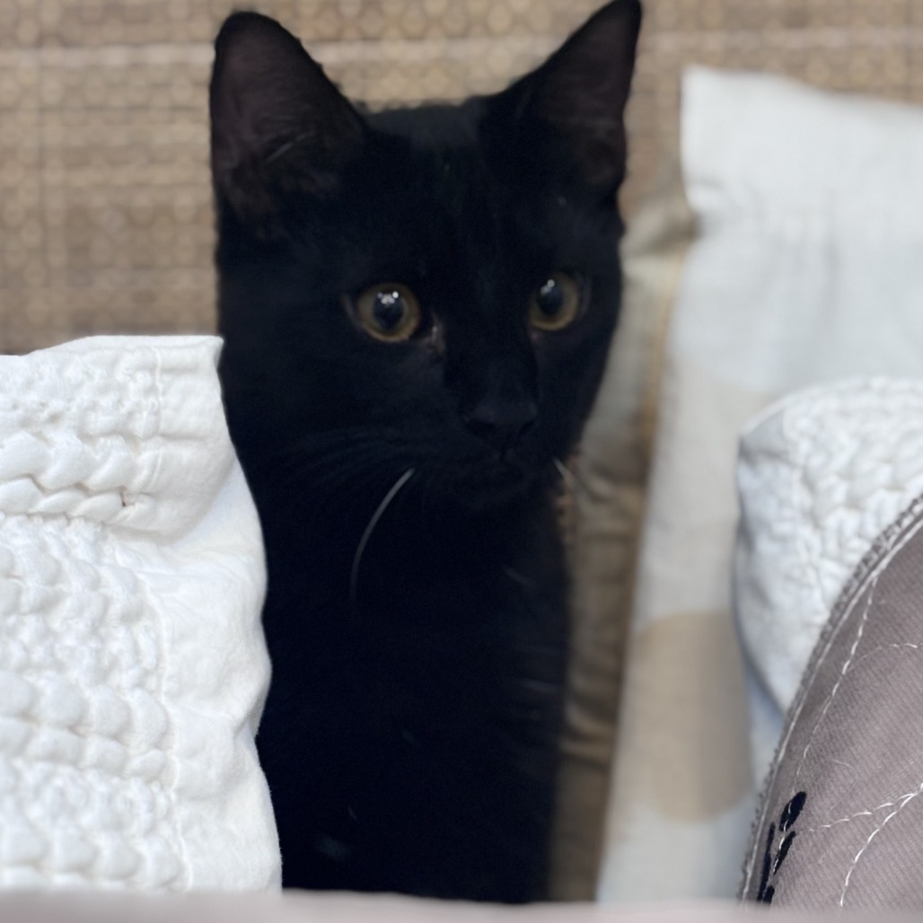 Opal is a stunning black kitten! She is all black except for 2 white whiskers and a few sparse white hairs on her neck. She is both sweet and cuddly and also an avid explorer and wrestler with her brother Onyx (ID: KRLA-A-87107). While she would love to be adopted with him, she would also thrive in a home with another young kitten for her to play and explore with. She loves to eat and drink water, and is perfect using her litter box. She is graceful, long, and lithe as she jumps off of furniture, with the looks and movement of a mini panther! Contact their foster: monica_marsden@hotmail.com