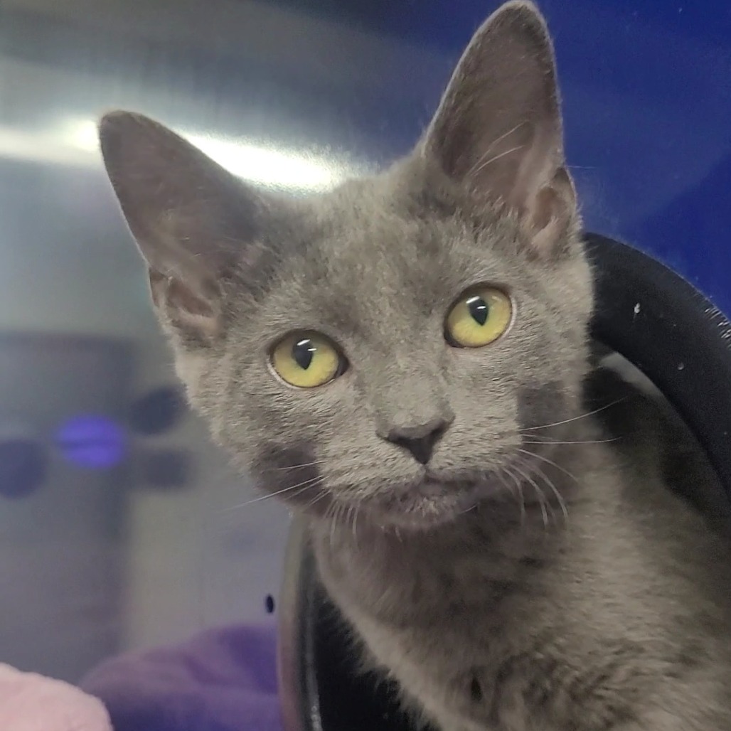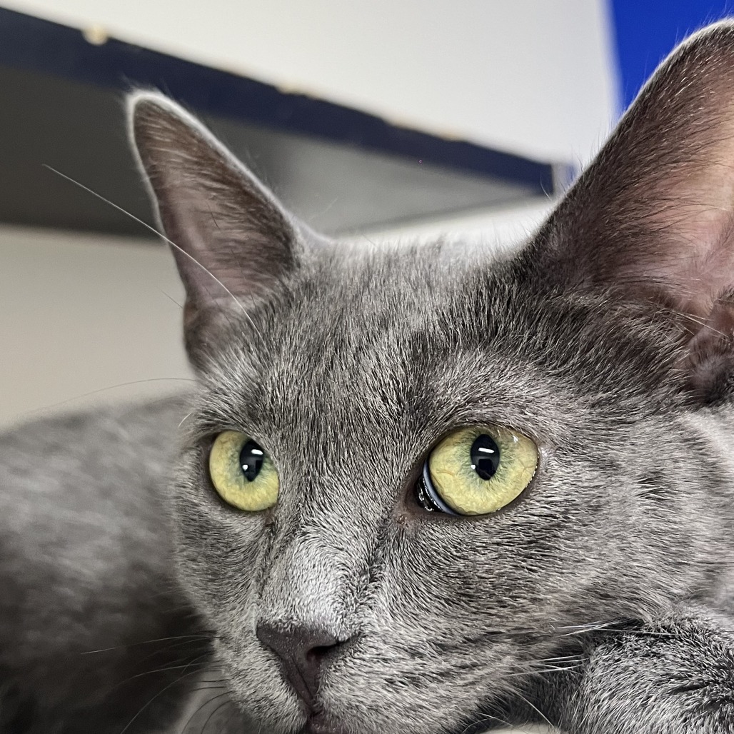 Noodle is one of those cats that captures your attention immediately. Curious and beautiful, she has the whole head-tilt, Insta-worthy thing going on! And her soft, all-grey fur goes with any household décor! Noodle enjoys patting toys across the floor and coming over for treats and some pets. She would thrive in a quiet home with a patient adopter, and is ready to binge-watch your favorite Netflix show with you! For more information, contact her foster: orlyahar@gmail.com