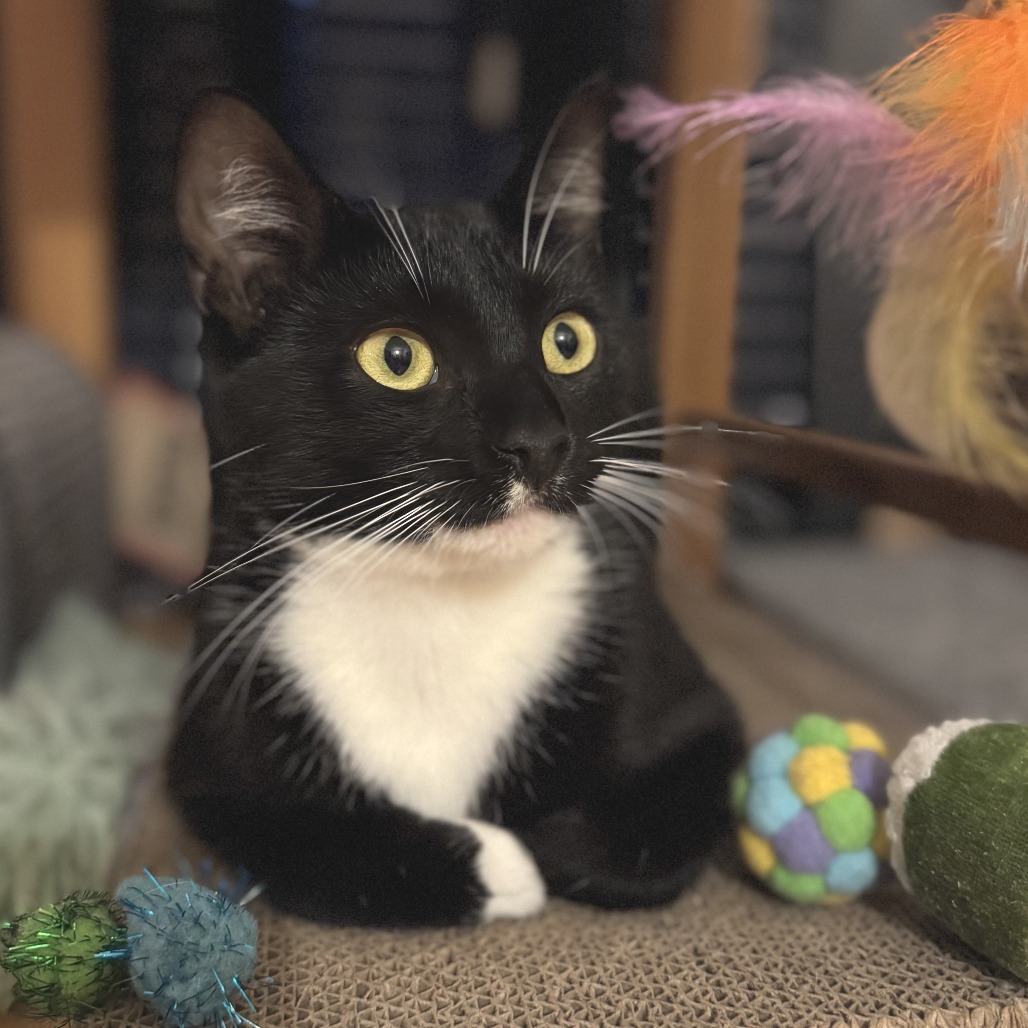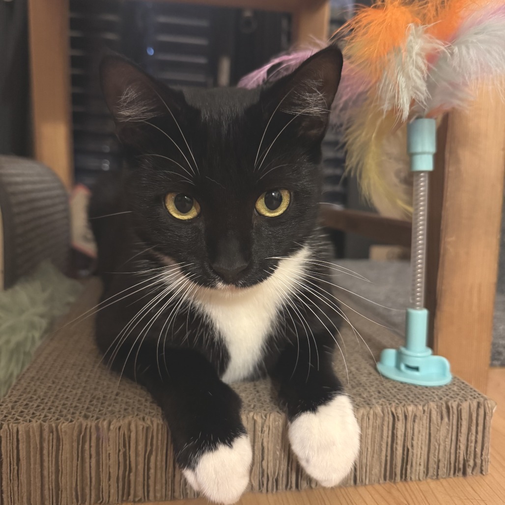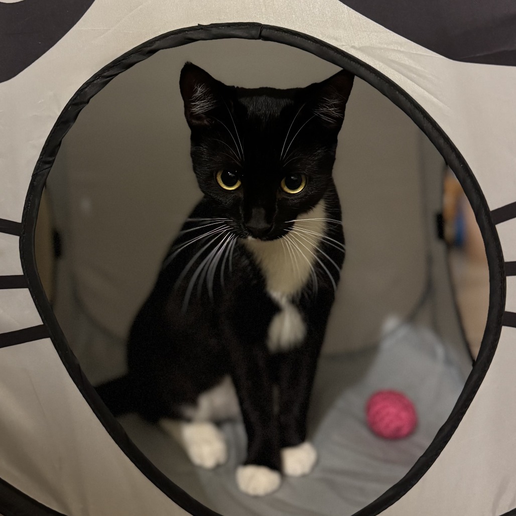 Momo is the sweetest and most gentle black tuxedo cat you will ever come across! She has the most beautiful face, with the white eyebrows and whiskers, and those big, impressive yellow eyes. She gets along well with other cats and has gotten really good at standing up for herself, being the only girl in her foster home. She loves playtime, especially with her favorite, her snake ribbon wand. She enjoys a good meal and loves to get treats, including her favorite, churu. She will let you cradle her like a baby and once you do, you will absolutely fall in love with her. She has the cutest high pitch chirpy meows, which only come out on the rarest of occasions. Sometimes, she will even respond with a meow when you call her name! Please contact the foster at Phoenix_river@hotmail.com