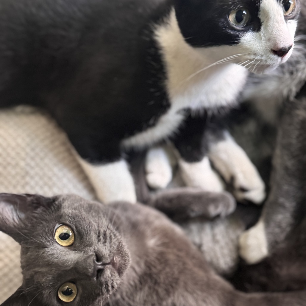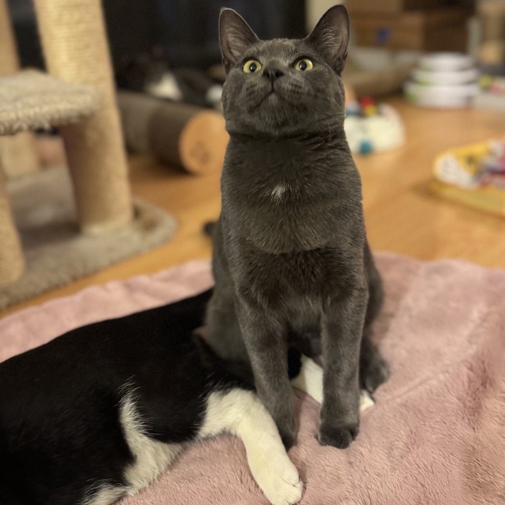 Kobe is super athletic and has boundless energy! He likes to be the top (alpha) cat so don’t be surprised if you see him stealing his sibling’s food at every opportunity he gets. He has the most handsome face and beautiful gray fur with a tiny patch of white on his neck (you gotta look real carefully or you might miss it!). He loves to wrestle with his brothers and show them he is the boss. He is very food motivated and will do anything for churu, his favorite treat. He also enjoys freeze dried salmon snacks. He can be rambunctious but will slow down after some rigorous play and start to purr. He loves to be loved and enjoys the company of people. His favorite toys are wand toys and he will show you how high he can jump to chase the wand! He would do best in a home with other energetic cats he can play with since he does like to play and has a lot of energy. Please contact the foster at Phoenix_river@hotmail.com