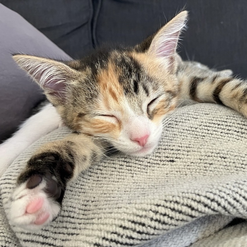 Meet Julep! One of the Old-Timey Cocktail Kittens, along with her brothers Hot Toddy (KRLA-A-87291), Sidecar (KRLA-A-87290) and Gimlet (KRLA-A-87288). Although the smallest of the litter, she’s the most fearless and confident. She’s always the first to try new things, paving the way for her brothers to follow. Not only is she curious and adventurous, she’s incredibly friendly, outgoing, playful, sweet and, obviously, stunning. Some of her favorite activities are wrestling with her brothers, chasing crinkly toys, being the welcome wagon when you come home, and draping herself across your lap. This beauty – a tabico (calico/tabby) – purrs constantly, loves to be pet, and welcomes aggressive human kisses all over her face and squishy belly. Due to her baby age, Julep must be adopted with one of her brothers or be adopted into a home that already has a young playful cat to be her new BFF. Please contact the foster at kelli.auerbach@gmail.com