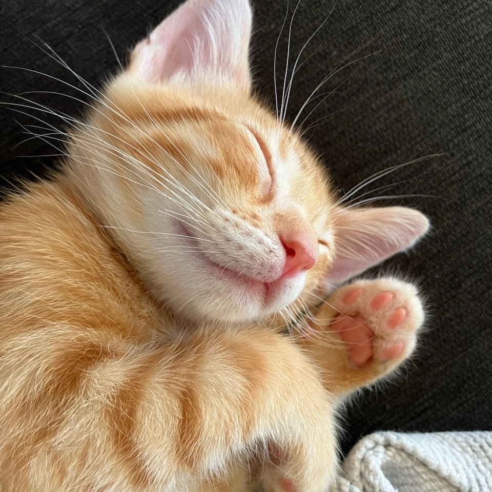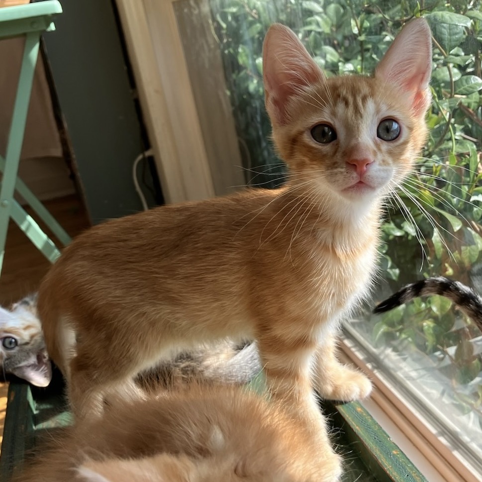 Meet Sidecar! One of the Old-Timey Cocktail Kittens, along with his siblings Hot Toddy (KRLA-A-87291), Gimlet (KRLA-A-87288) and Julep (KRLA-A-87289). Sidecar lives up to the reputation of orange kitties. While he was in utero, and brain cells were being doled out, he was off to the side, swimming in circles and chasing his tail, so didn’t receive even one cell. While he may not be the smartest kitten he is, hands down, the absolute sweetest. Truly. All he wants is to be in your arms, on your lap, curled around your neck, purring constantly. He can’t get close enough. He literally tries to smoosh his tiny snout up your nose because he wants to inhale you. In addition to being goofy and adoring, he is playful, very friendly and social, and oh-so-cute. Due to his baby age, Sidecar must be adopted with one of his siblings or be adopted into a home that already has a young playful cat to be his new BFF. Please contact the foster at kelli.auerbach@gmail.com