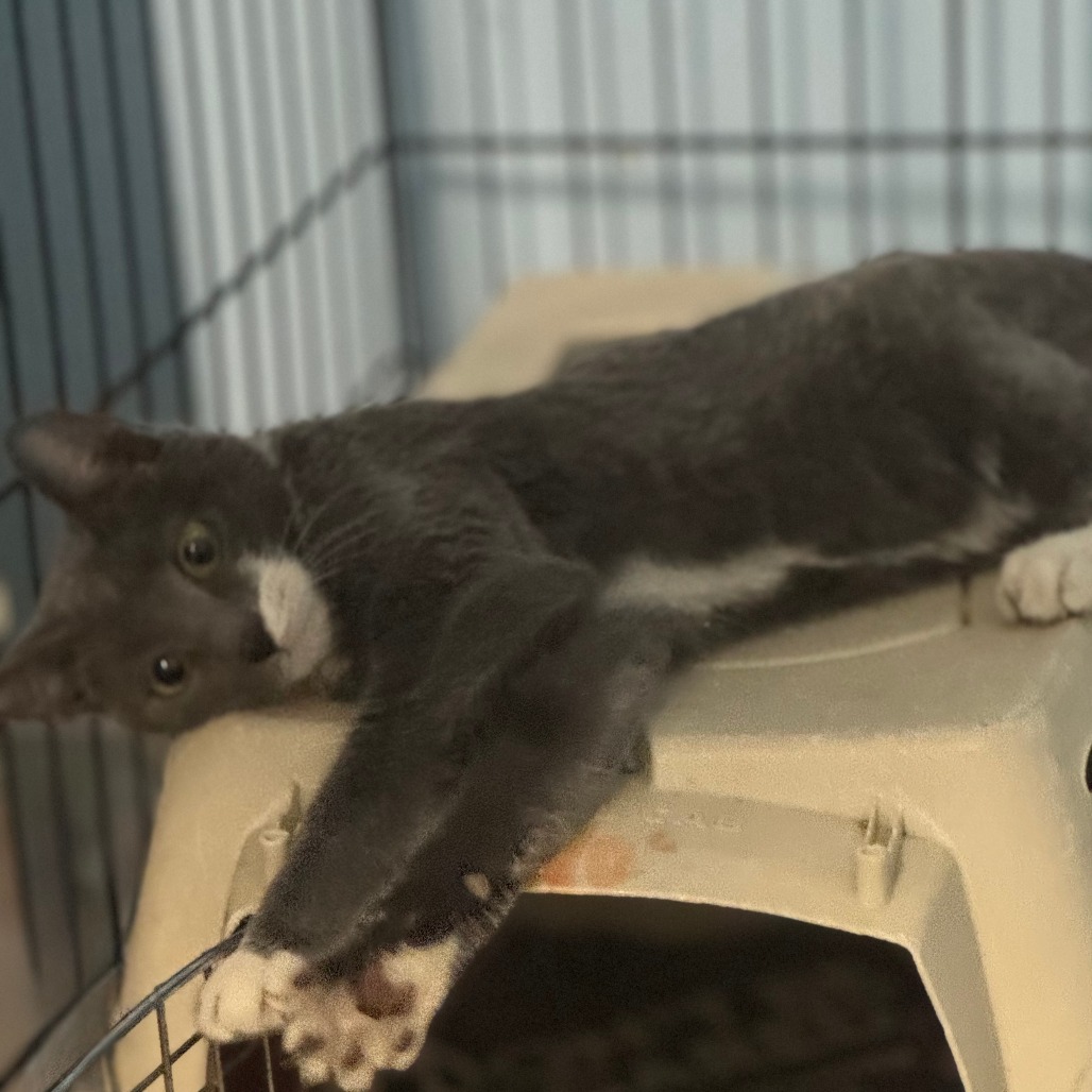 Captain Fuzzpaws is a delightful little guy who is a little shy but with a little love, will turn around fast. He has a hard start in life; He was turned in to the shelter when he was a tiny kitten and stayed in the medical unit due to overcrowding at the shelter. Shoved in the last cage, he got his physical needs met but the shelter staff is too busy to socialize kittens. He was not noticed for adoption since he was shoved in the corner. When his 'final notification' went out, a KR volunteer took him home. He became instantly playful with the other kittens, loves to get pets and is actually a social little cat. He doesn't like being picked up yet, but should be able to soon. Captain Fuzzpaws is a very playful and inquisitive character with a shiny, silky coat. He would be a perfect family pet, just needs a little time to decompress when he gets home with you. Please contact the foster at savetinylives@gmail.com