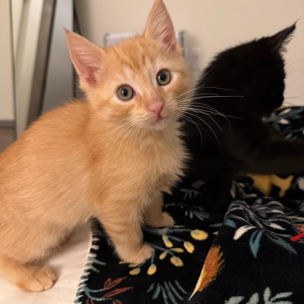 Marzipan may be tiny, but she carries herself with the confidence of a lioness. This friendly little ginger girl trots through life with her tail curled sweetly over her back—like a miniature husky who knows she’s absolutely irresistible. The moment you step into the kitten room, Marzipan is already scampering straight toward you with bright eyes and an eager bounce, ready to be scooped up and adored. And once she’s in your arms? The purrs start instantly. She practically hums with happiness, melting into your chest as though cuddling is her most important job in the world. Playtime is where Marzipan shines just as brightly. She loves a good game of chase with her brothers and is a fierce—and hilariously dramatic—hunter of toy mice. If one of her brothers dares approach her hard-won “prey,” she’ll let out the cutest little growl, determined to defend her prize with every inch of her tiny, mighty self. Full of charm and endless affection, Marzipan is a one-of-a-kind sweetheart who brings joy wherever she goes. Anyone lucky enough to call her family will have a tiny, purring shadow forever by their side. Because of her young age, Marzipan will need to be adopted with another kitten or to a home with another kitten or young cat. Either of her littermates - Sugar Plum (KRLA-A-87471) or Gum Drop (KRLA-A-87472) would be an ideal buddy for her. Please contact the foster at patvan@pacbell.net