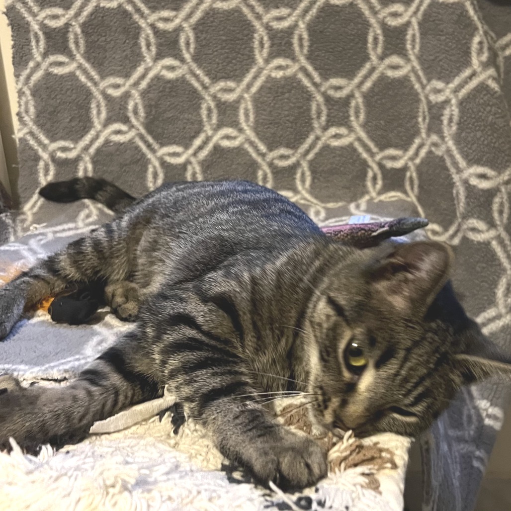 Mila, this sweet, curious girl with her lovely disposition and playful side will be a marvelous companion. This tabby girl born Feb 1st, 2025 (nine months old at the time of writing), was abandoned on the streets of LA, but let rescuers know immediately she's a keeper, friendly and cuddly. She has gotten a taste of the indoor life, a will settle for nothing less, food that comes to you, love on tap, yes please! This affectionate girl has lots of love to give and would make a wonderful new addition to a safe, loving home. Please contact the foster at tinabixler68@gmail.com