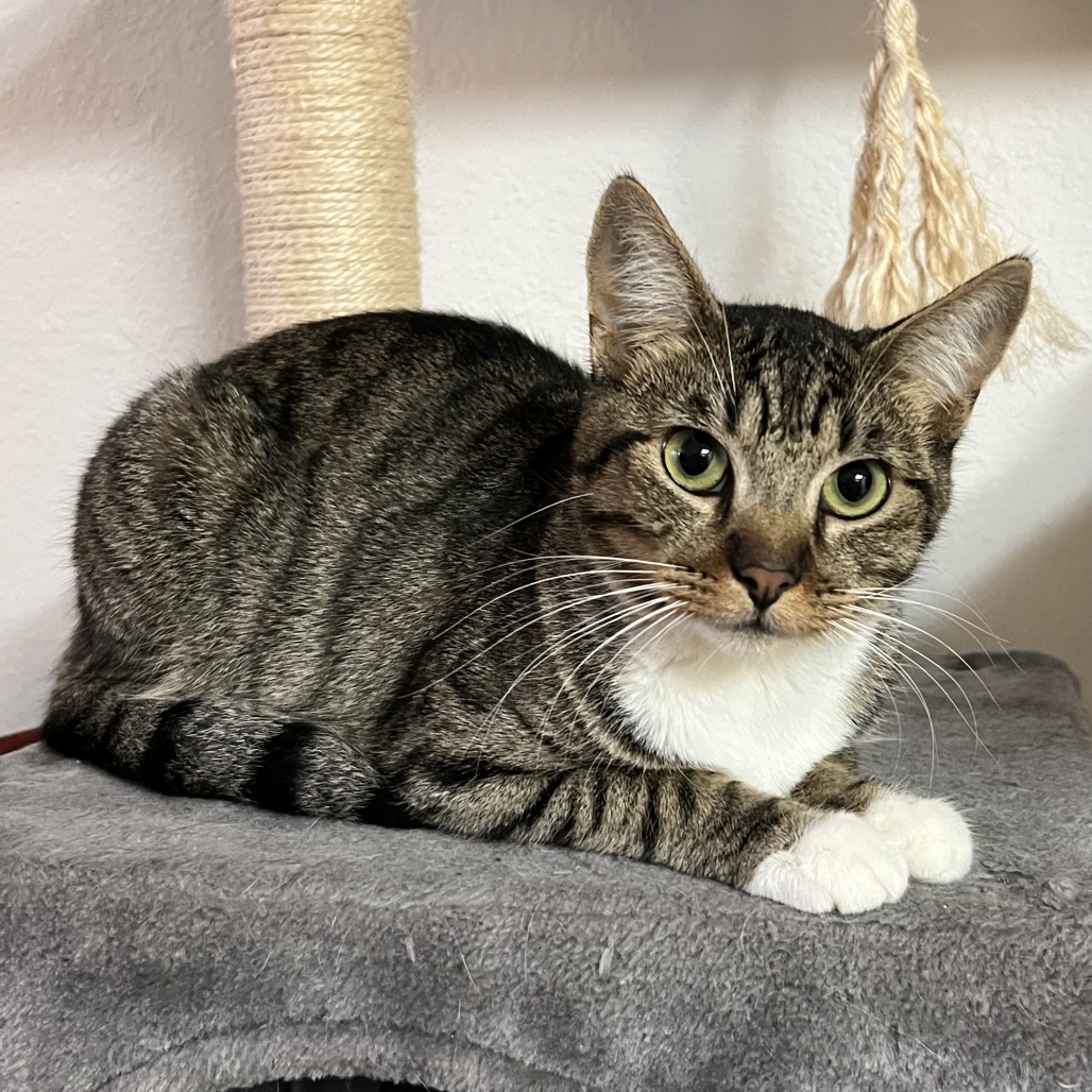 Agatha was found as a stray, the proud mother of 3 kittens! Her kittens are all grown up and now Agatha is looking for her forever home. While she is pretty shy/scared, she is warming up to people and slowly getting used to life indoors. She loves watching out the window and lounging on furniture. She is also litter box trained. A perfect home for Agatha would be quiet, with a patient owner who has the time to let her slowly come out of her shell. She will likely do well with other cats (she really likes my cat!), if she is able to be slowly introduced. Agatha is still very alert and timid as she gets used to people, yet she is very happy to hang out nearby. Her energy is currently on the lower end, except for when she is playing with her wand toys. Agatha enjoys food and treats, most of all! While she is shy and sometimes hides, she almost always emerges to eat treats out of your hand. She especially loves the lickable treats (like Churus). She also loves her scratch pad (both to scratch and to lounge on). While Agatha will need some extra time and care, she is so worth it! She is a really sweet girl and I think she will make a wonderful companion, once she feels safe and secure. Please contact the foster at hayleysfosters@gmail.com