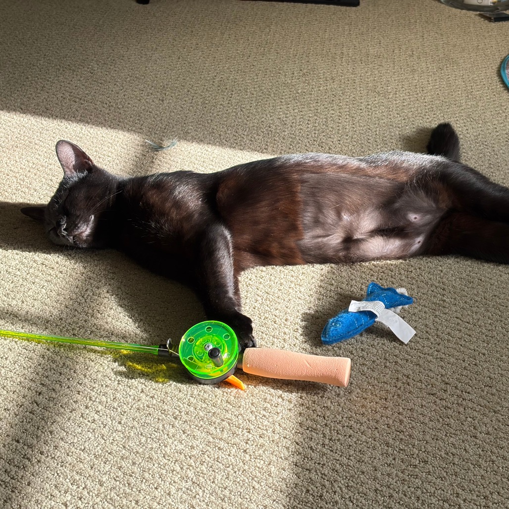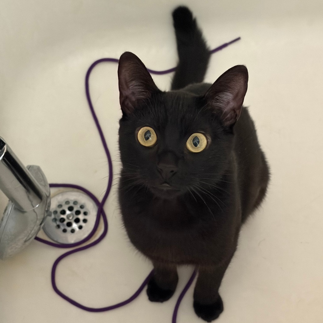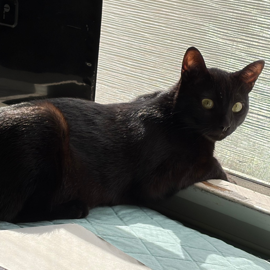 Jett has a soft, glossy black coat and big golden eyes full of curiosity. She is a little explorer who loves to chase toys and pounce on imaginary prey before finding a sunny spot for a cozy nap. Like most young cats, she has bursts of playful energy followed by peaceful downtime. Jett has a unique charm: a small bump and slight bend near the end of her tail. We believe she was either born with this or it is an old injury, but it does not hamper her in any way. While she may not be a traditional lap cat, she thrives on companionship and loves to be in the same room as her people, often curling up next to you on the couch. She loves her playtime with fishing pole toys or shoelaces, and is also happy to play independently with her battery-operated mouse and plush toys. Jett would do well in a loving home that can provide plenty of playtime, attention, a feline playmate, and a safe space to grow. If you are looking for a loyal, playful, and loving companion, Jett might just be the perfect match. Please contact the foster at lisajg13@gmail.com