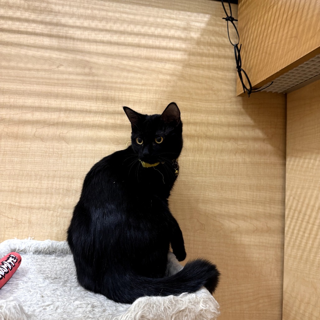 Piper is a wonderful cat mom who gave birth to six babies. A friendly stray taken indoors just a few days before she gave birth, now she deserves her own furever home and doesn’t have to worry about having another litter of kittens again. All of her babies are exactly like her, solid black. She didn’t run of ink printing these babies! Even though Piper was from the streets, she is super friendly with a calm and low-key demeanor. Now that she is free from the duties of being a mom, she shows her love for pets, food, and toys. One of her girls, Raven (A-87580), appears to be inseparable from her. Out of all of the siblings, Raven is the only one that is constantly sticking by mom’s side. Wherever Piper goes, Raven follows. Piper would be best adopted with Raven (A-87580). Please contact the foster at rao_z@hotmail.com