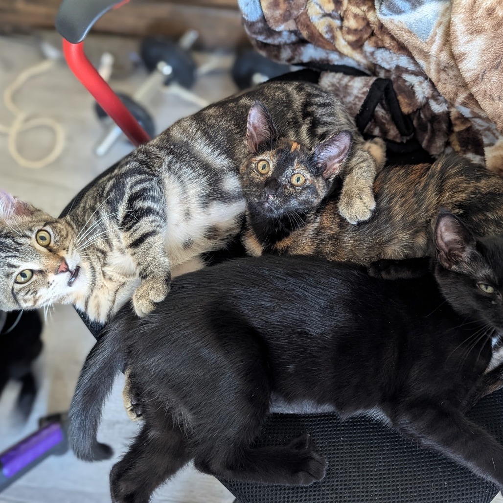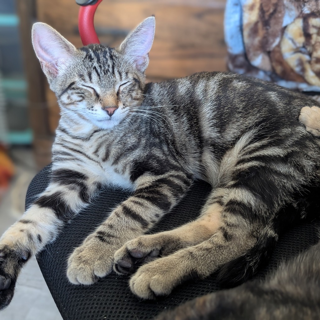 Nimbus is a brown tabby with the cutest oversized ears and gorgeous swirly stripes. He's playful, brave, and endlessly interested in whatever you’re doing. Nimbus is the type of kitten who loves to sit in your lap... or on your keyboard just to get your attention. He’s a fearless little explorer with tons of energy and a very sweet heart to match. He loves romping with his siblings Pepper (87594), Dusty (87593), and especially his favorite buddy Spice (87595). He’d be thrilled to go home with one of them so he always has a built-in playmate. If adopted solo, he’ll need another friendly cat to chase, wrestle, and snuggle with. Nimbus has been raised in a work-from-home household, so he’s very comfortable around people and other cats. He hasn’t met dogs yet, but with a proper introduction, he should do just fine. f you're interested in meeting Nimbus, please contact the foster at sydneymitchel@gmail.com.