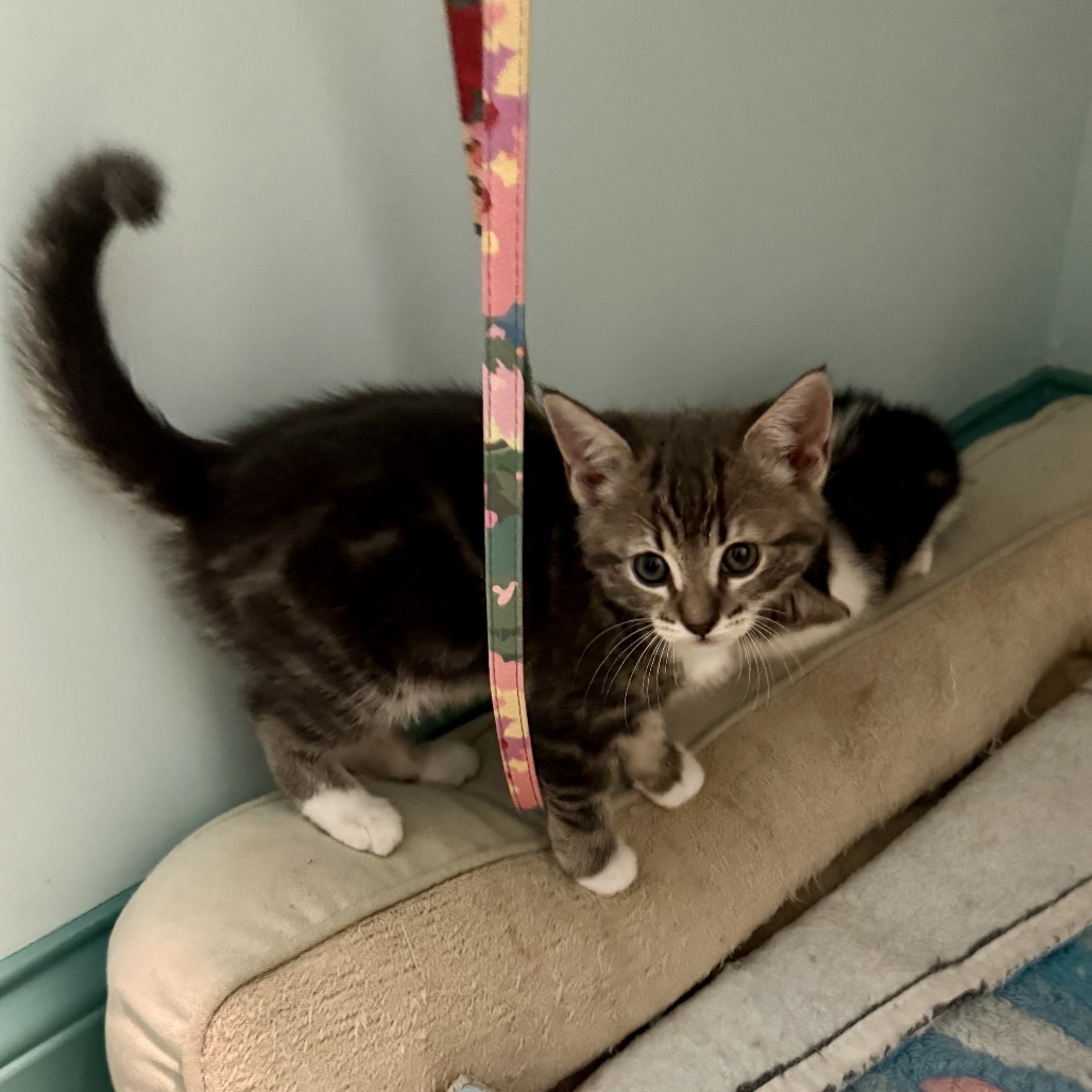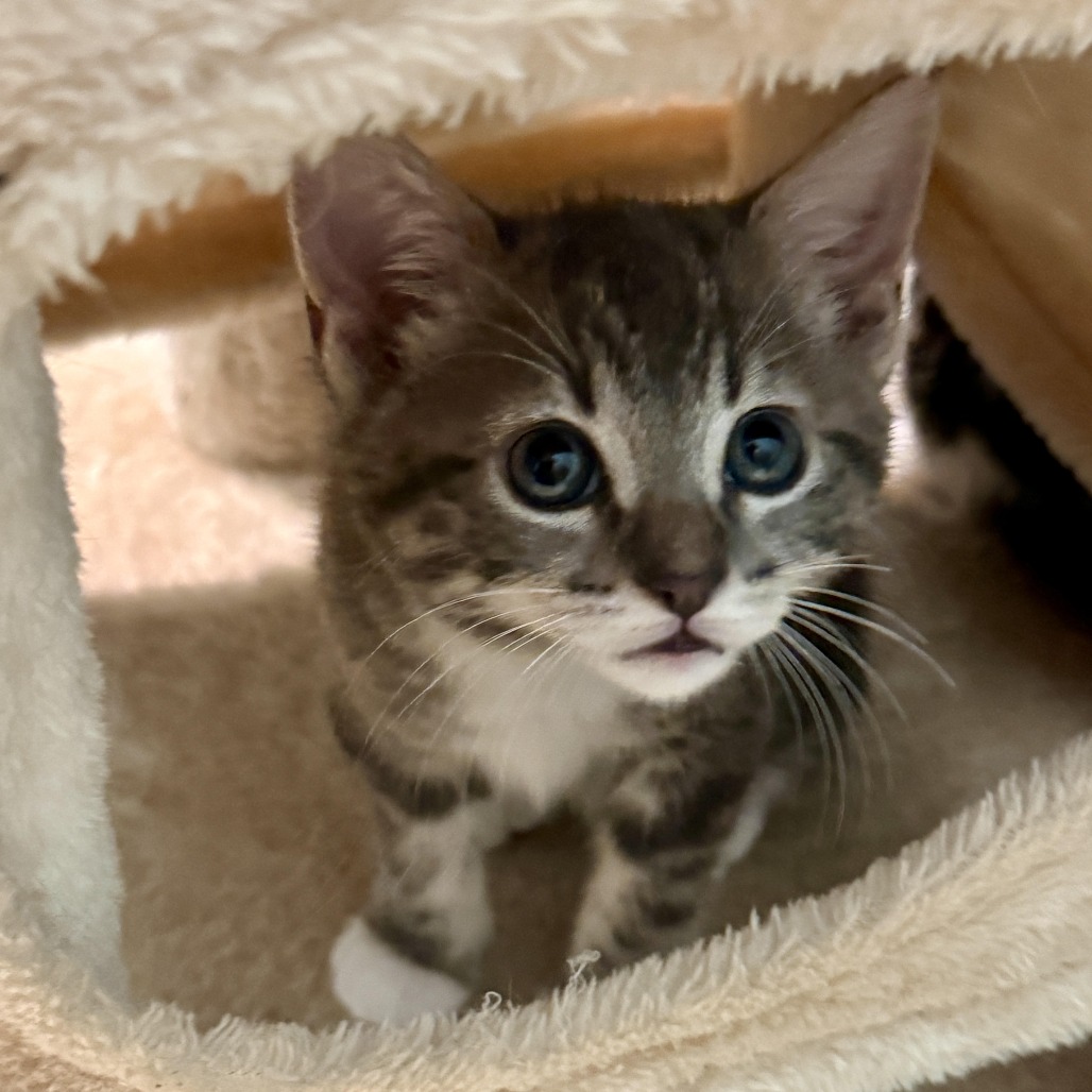 Joey and her siblings are very lucky kittens! They were born in a foster home after their very pregnant Mama was rescued from the streets. Joey is a super snuggly and affectionate, very playful kitten! She can play for hours with all of her siblings but also she really loves her humans. She starts her motor purring as soon as you give her any attention! Joey would love to be adopted with any of her siblings Jacob KRLA-A-87637, Jaclyn KRLA-A-87638, Jessica KRLA-A-87639, or Mama Juniper KRLA-A- 87635. If you already have a young, playful kitty at home then she can bond with your kitty too. Joey would do well in almost any home. She gets along with other kitties and would be great in a home with gentle, loving children. She has also been fostered in a home with small dogs. She will brighten any home with lots of love and her silly kitten antics. Please contact the foster at annmariehair@gmail.com