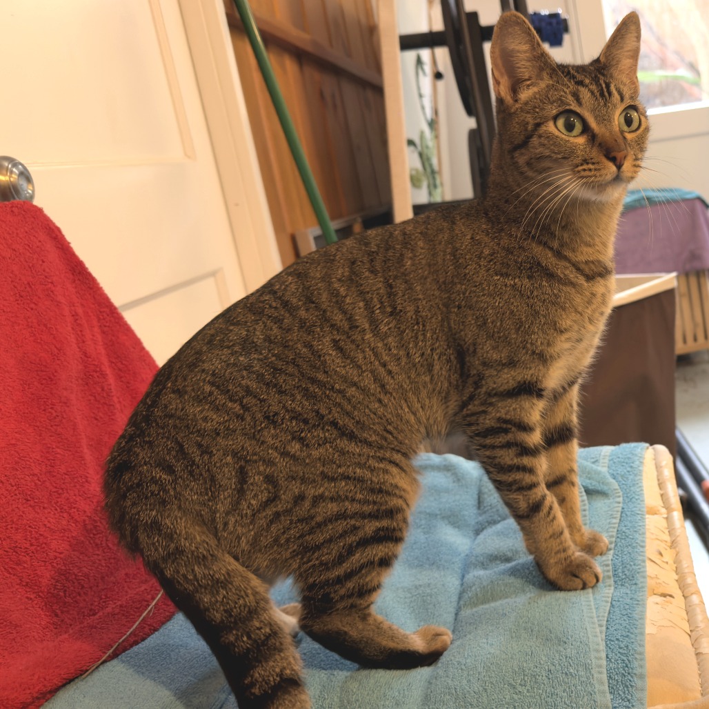 Mable is very friendly loves to play and be petted and loves cuddles. She has Grey and black stripes. and stunning green eyes. She is looking for a forever home. Mable runs to greet me whenever I enter the room. She will flop down at my feet and want to immediately play or cuddle. She is very smart and loving and loves to jump up into my lap and take a nap. She will make some lucky family very happy. Please contact the foster at ccarlisle08@gmail.com