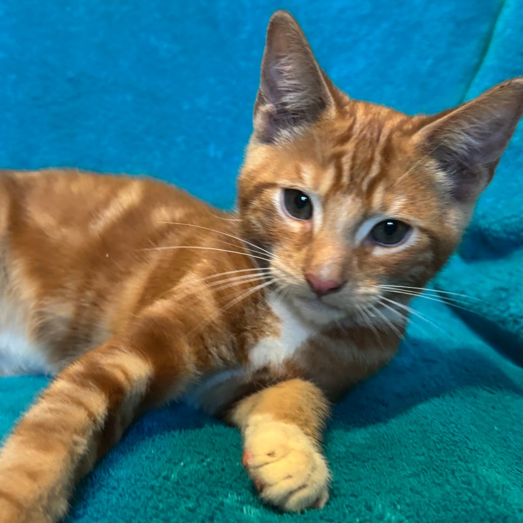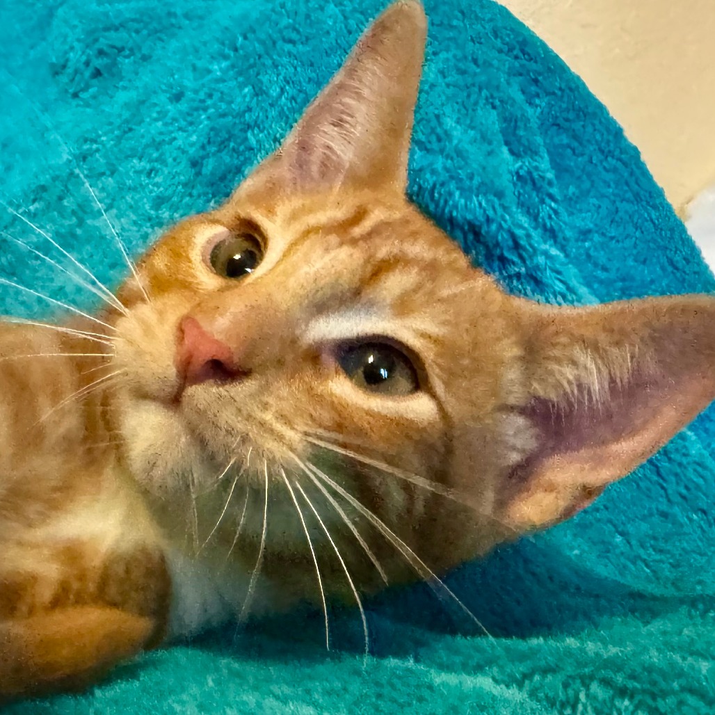 Froggy is the most sweet and friendly kitten. He will provide you with so many hours of joy and entertainment watching his crazy kitten antics. He will run to meet you at the door, race around the house playing, and would love to cuddle with you while your sleeping. He is really playful so should go to a home with another friendly cat or can be adopted with one of his brothers; Porky (KRLA-A-87692), Spanky (KRLA-A-87695), or Alfalfa (87694). Froggy is an unusual deep orange color and the most handsome boy. He is used to a small friendly dog. Please contact the foster at Savetinylives@gmail.com
