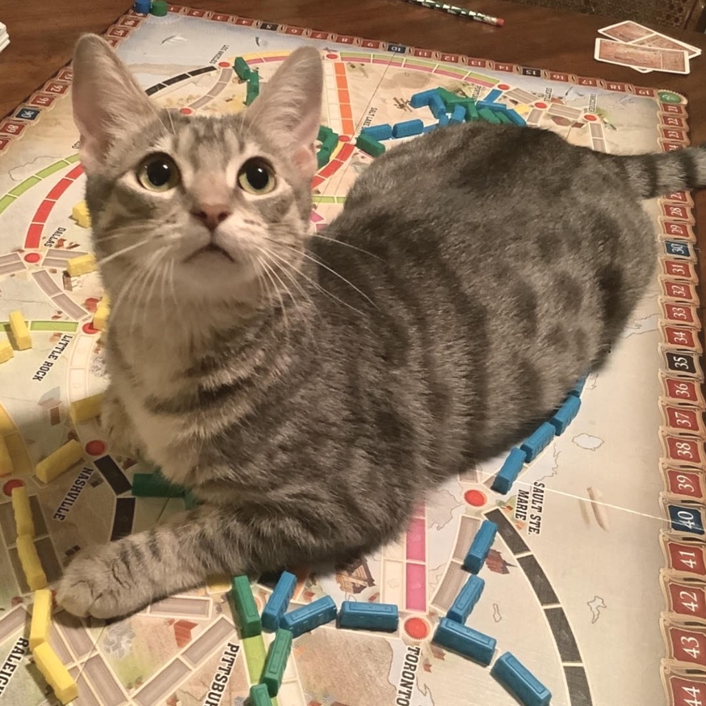 Alexandra is a wonderful, affectionate and curious teen kitty, with striking markings, a cute striped tail and big beautiful yellow green eyes. She starts purring as soon as you pick her up and cuddle her. She loves to put her front paws on your shoulder and look around the room when in your arms. If you are playing a board game, she politely waits until you’ve finished, to “join in,” and has the charming habit of curling just one paw under, when lying on her side. Alexandra has found the best spots to bask in the sun, or where she can keep an eye on everybody. Chasing a wand toy around, playing chase with one of the kittens, hunting insects and taking in the sights from a windowsill are favorite pastimes. Once she captures a toy, she likes to run off with it, to “claim” it! And then eagerly awaits starting the hunt all over again. She is so sweet. She’s really just a big kitten herself! Please contact the foster at echoparkkitten@gmail.com