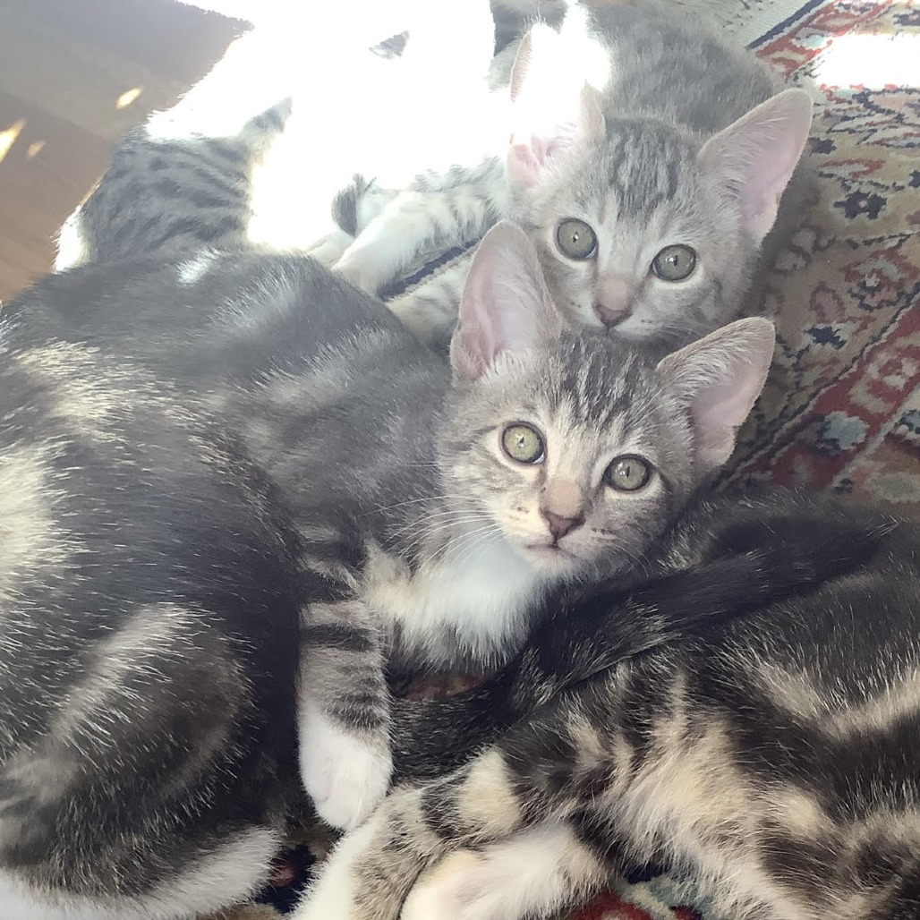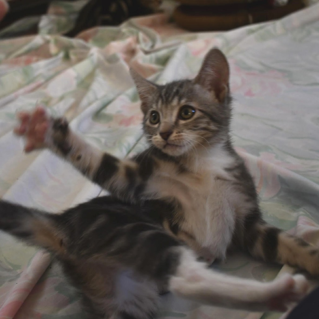 Cashew dances to her own beat. She’s a quirky and engaging little kitten who loves to play and snuggle. The smallest of her litter, she is just adorable, in her little grey and white tabby tuxedo, peeking out of boxes and running away with her plastic easter eggs or other toys. She’s one of the best hunters, leaping out from behind a corner to catch one of her siblings. When the tiny hunter is all worn out, it’s time for a nice long nap on top of your warm feet. If she’s cleaning herself, she might give your hand a little lick of love, too. As a young, active kitten, she needs to be adopted into a home with another young cat or kitten, like one of her siblings, Athena, Bengal, Turtle or Weslie (KRLA-A- 87841, 87843, 87844, 87845), or her young Mom, Alexandra (KRLA-A-87840). Please contact the foster at echoparkkitten@gmail.com