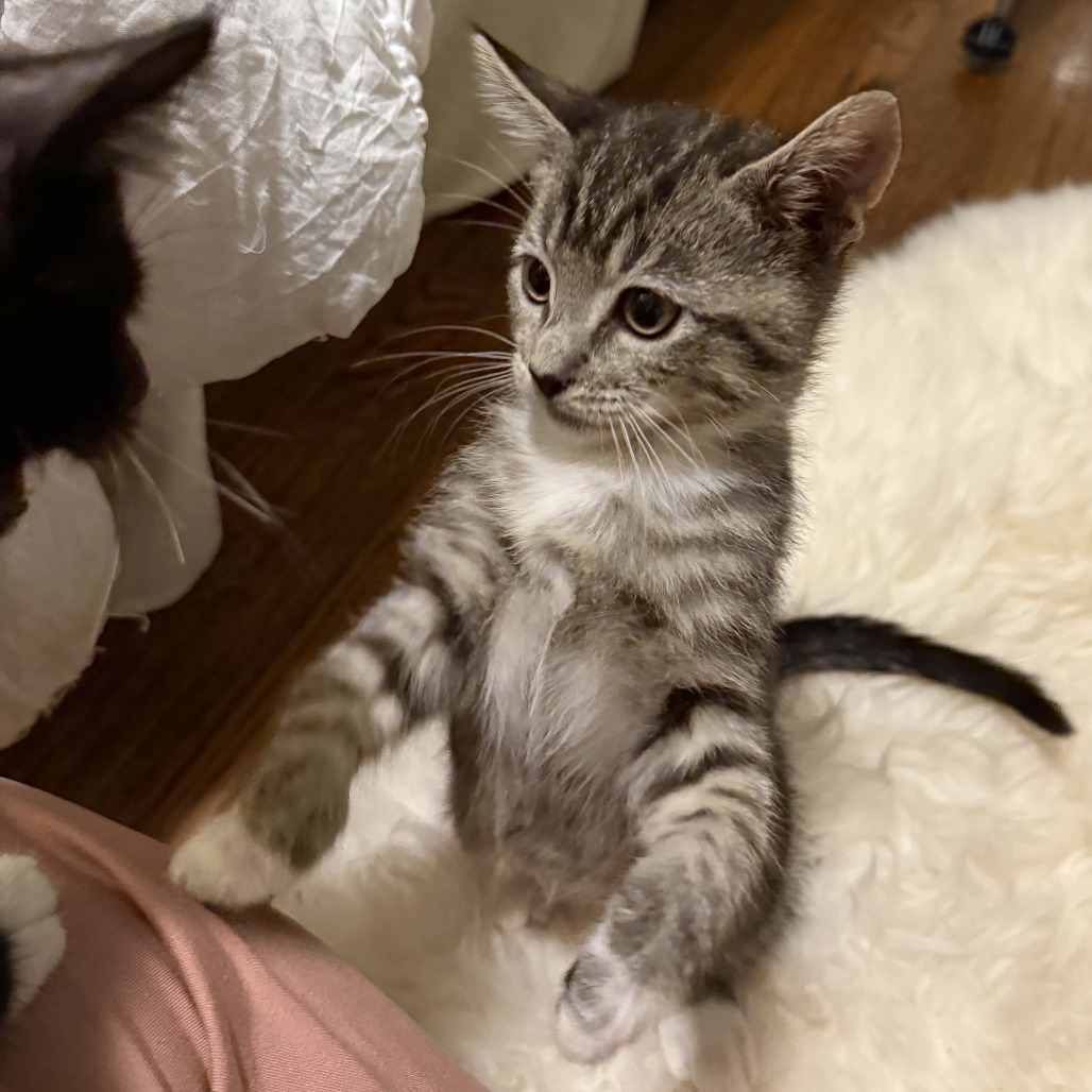 Ziggy is a tabby kitten who has decided that humans are her favorite toy — and honestly, she might be right. She actively seeks out playtime with the people in her home, whether that means chasing a wand toy, pouncing on moving feet, or climbing up to claim her favorite perch: your shoulder. Ziggy is the kind of cat who makes you feel chosen. She thrives in homes where people want an interactive, engaged companion rather than a cat who keeps to herself. She does wonderfully with children and fits naturally into family life, bringing energy and personality to every room she enters. If your household is ready for a cat who will genuinely play with you — not just near you — Ziggy is your girl. Please contact the foster at mariahcone1@gmail.com