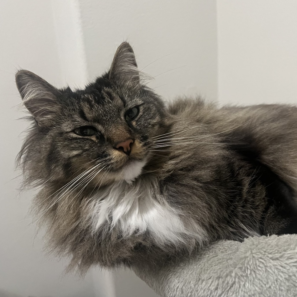 Binky is a very sweet, very fluffy kitty who enjoys kneading a soft blanket or relaxing in a cozy spot. He has gorgeous green eyes and is always ready for pets, sometimes even jumping up on his back legs and nudging your hand for attention. Binky thrives on companionship and loves being near his people, happily settling in on your bed or somewhere soft within reach. He has a playful side too, but he’s mostly content soaking up affection and taking long naps. With his affectionate nature, Binky would make a wonderful addition to a home looking for a loyal, easygoing, and incredibly cuddly feline friend. Please contact the foster at wyattmeagher@gmail.com