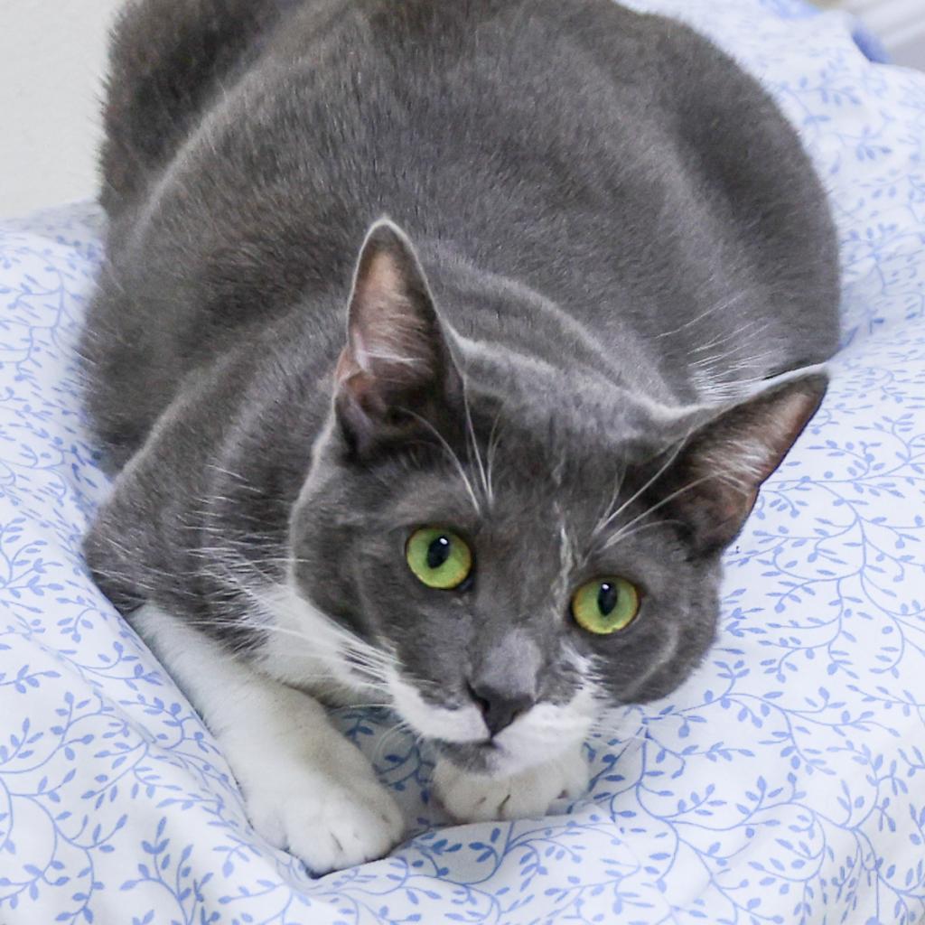 Dracula is an unusual girl! Elegantly attired in her grey and white tuxedo coat, and minus a full tail, she’s a bit quirky, and can be touch sensitive. Her glowing green eyes are mesmerizing, and she seems to have a look of profound sadness. But despite her namesake, Dracula loves a patch of sun as much as any other kitty, as well as treats, toys and play—we’re sure that with some patience, love, and gentleness, this young girl can blossom. If you’re looking for a kitty with a unique look, Dracula’s your girl! Find out more and contact her foster at orlyahar@gmail.com