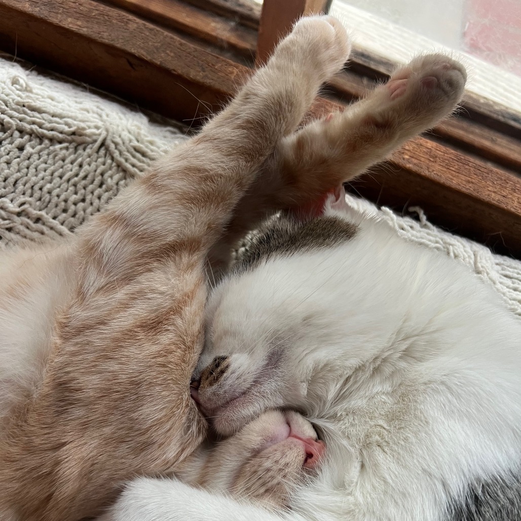 This lovable oddball of a cat was rescued at the end of 2023 with his brother and sister, who have since been adopted. Cheese was bottle raised and so is incredibly friendly and social - whenever anyone comes to the house, he's front and center to greet them, rubbing against their legs and prancing around like a little weirdo. Cheese's idiosyncracies include being a word class splooter, flopping on his back and rolling around while maintaining eye contact, and zooming around at a thousand miles per hour. But he's also a really dedicated lap cat, and loves nothing more than cuddling up in the evening. We all know that it's common to give cats nicknames, and sometimes you might call them by their nickname so often it ends up replacing their actual name and they respond to it more actively. Is this the case with Cheese, and is his nickname and the name he responds to "Stinky Cheese"? Why yes it is. Don't blame his foster parents, he really is a little stinker. But he's a stinker who is so endearing he will leave an indelible mark on your heart and be an absolute joy in your home. After his siblings were adopted, Stinky Cheese was very forlorn for a few days, but then his foster parents brought home a kitten named Herbie and the two of them bonded like brothers from another mother. They play, cuddle, zoom, wrestle and sleep together constantly, and really should be adopted as a pair. If you're interested in learning more or in meeting Stinky Cheese and Herbie, drop a line to his foster dad at ben@kittenrescue.org.