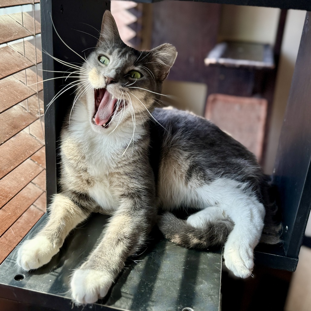 River is a strikingly handsome rescue cat with a calm, easygoing nature. He enjoys life’s simple pleasures—lounging on a sunny windowsill, relaxing in a cozy cat tree, or snuggling up with his foster siblings for long, peaceful naps. Though mostly mellow, River does have a playful side that comes out when the mood strikes—especially if treats or wet food are involved (his favorites!). River would thrive as a solo pet or alongside a friendly resident cat. If you're considering adopting a pair, ask his foster mom about his best feline friends—she’d be happy to set up a meet and greet. Come meet River and see if he's the purrfect match for your home and heart. Please contact the foster at kittyLINQ@gmail.com