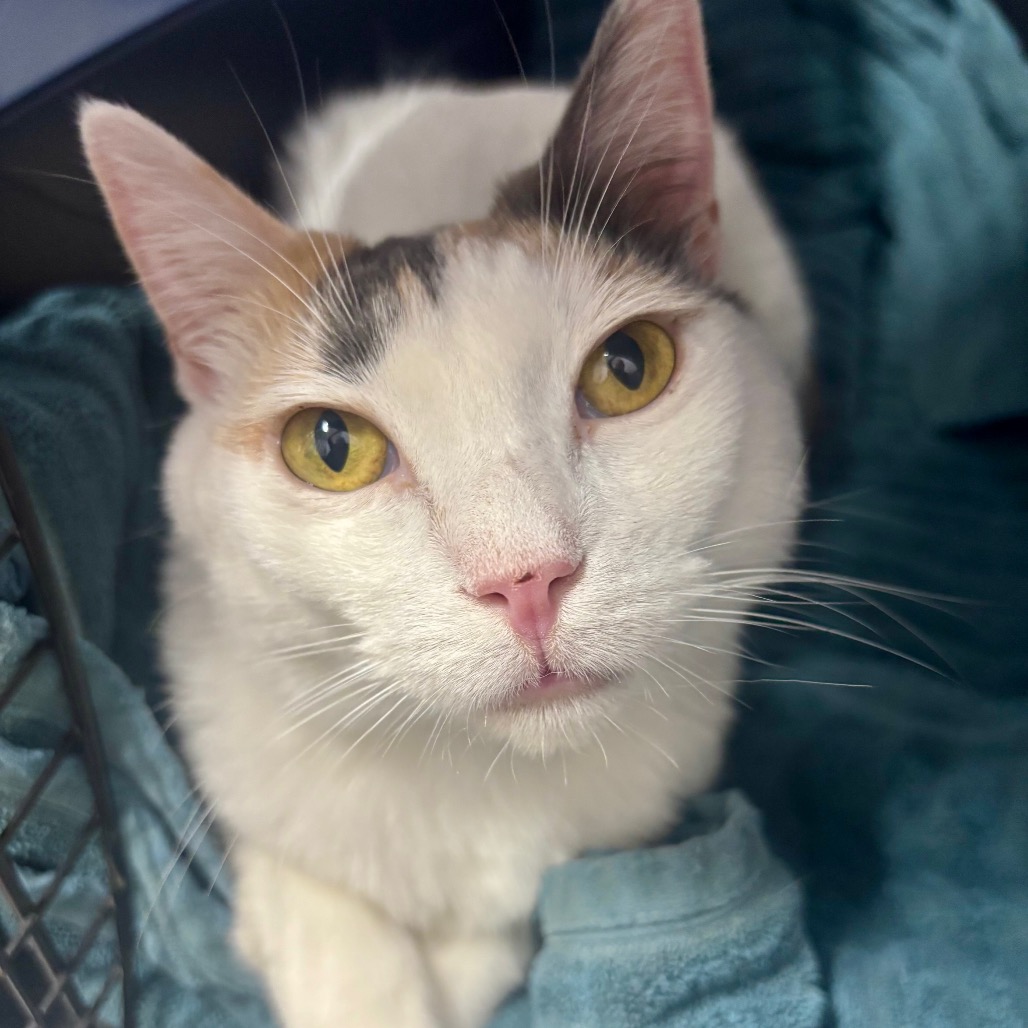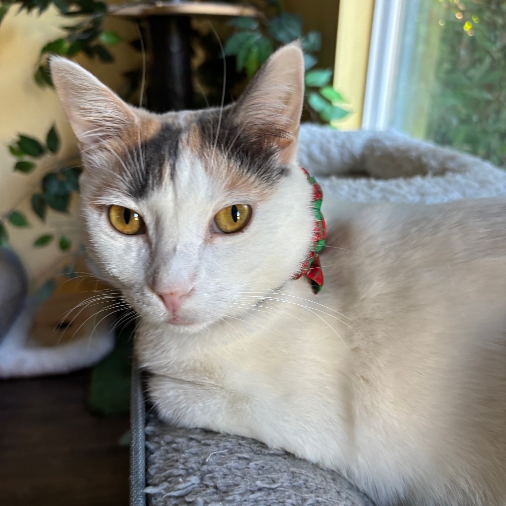 Opaline is a friendly, engaged dilute calico kitty with the most beautiful goldenrod eyes and soft bunny fur. She is sweet with humans and other kitties alike, and she loves a good snuggle with either or both! She is looking for a home with another kitty and wants to be adopted with her sister and best friend Garnet (KRLA-A-7479). These ladies are such a wonderful pair! Please contact the foster at kizmetkats@gmail.com