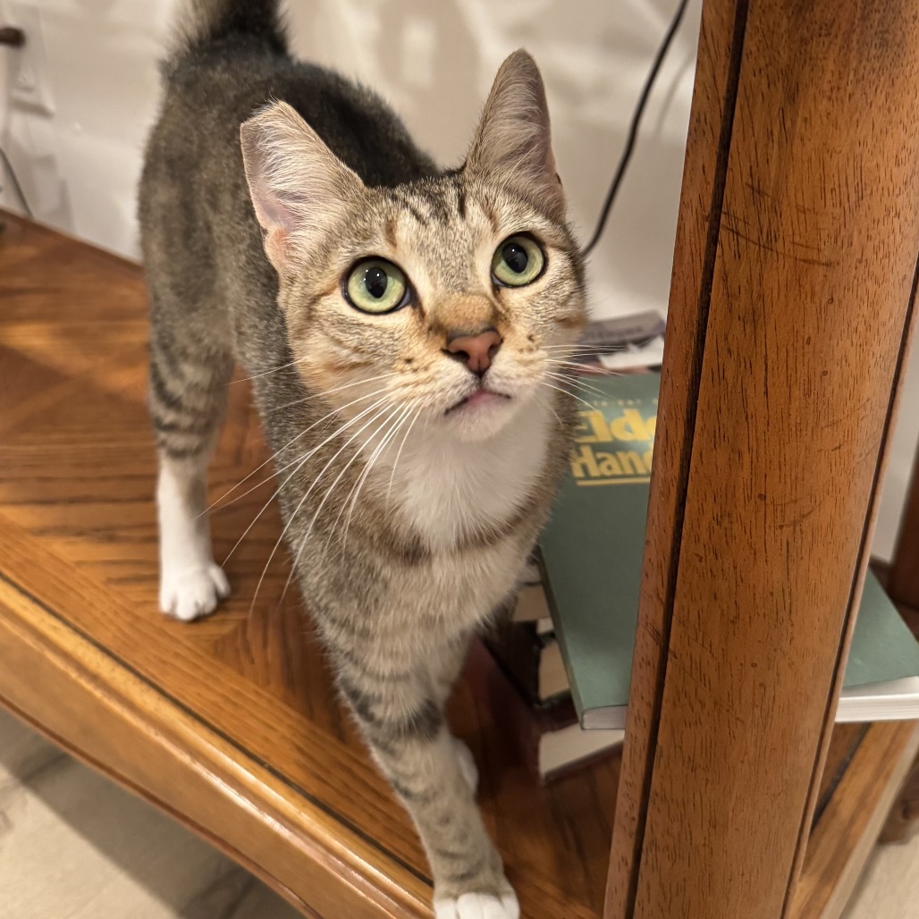 Tabigail Adams is a spunky, energetic girl who loves to make humans friends and play, play, play. She may be an adult, but she has the heart of a kitten, chasing, pouncing, and carefully leaping! If you are looking for an active kitty who also loves to cuddle and receive attention, then Tabigail is your girl. She loves to chase balls, wand toys, play mice, and anything else you can dream up! In many ways, she is a cat that behaves a lot like a dog. She loves to have her humans engaged in playtime with her, although she can occupy herself during the day if you're away from home. She is also very attuned to communication and will hop up when you pat a spot near you, particularly if you practice with her. She prefers to be the only cat in the home, but is neutral and curious about the small dogs in her foster home. Tabigail does best when she avoids certain proteins in her food, which her foster parent can share more about with you if you reach out at catermeierhaus@gmail.com. You can also learn more about Tabigail on her foster family's Instagram @fosteringissavinglives.